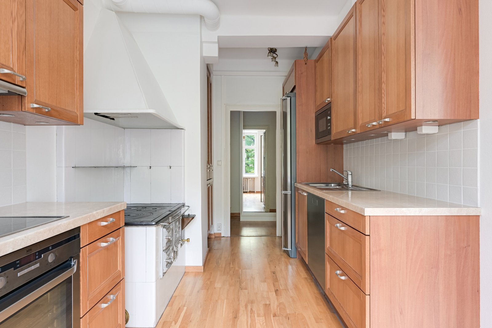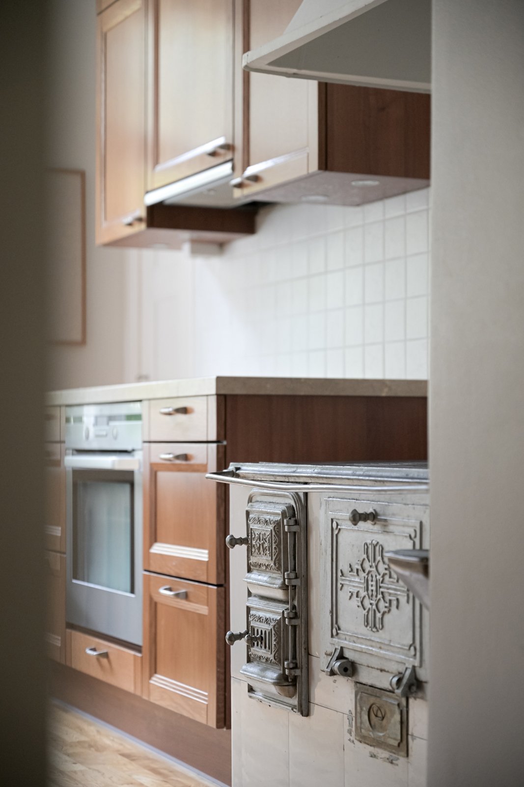 Erillinen keittiö, jonka välittömässä läheisyydessä ruokailutila. Keittiössä jääkaappi/pakastin, astianpesukone, liesi, liesituuletin, uuni, mikrouuni. Tammilautaparketti. Keittiössä kaunis puuhella (hormi ei ole käyttökunnossa).