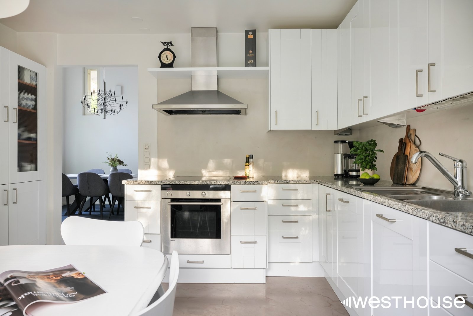 Keittiö on tyylikäs ja erillinen, varustettuna nykyaikaisilla laitteilla. Keittiön kiviset ja puiset tasot sekä mikrosementtilattia tuovat modernia ilmettä. Makuuhuoneita on 4–5, joten tilaa riittää isommallekin perheelle tai työtiloiksi.