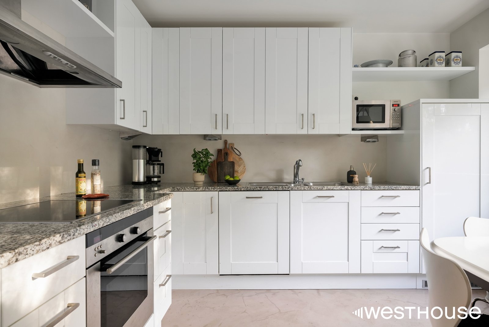 Tyylikäs erillinen keittiö, varusteina: Jääkaappi, pakastin, keraaminen liesitaso, erillinen uuni, astianpesukone, tasot kivi+puu. Lattia mikrosementti. Keittiön ovet maalattu.