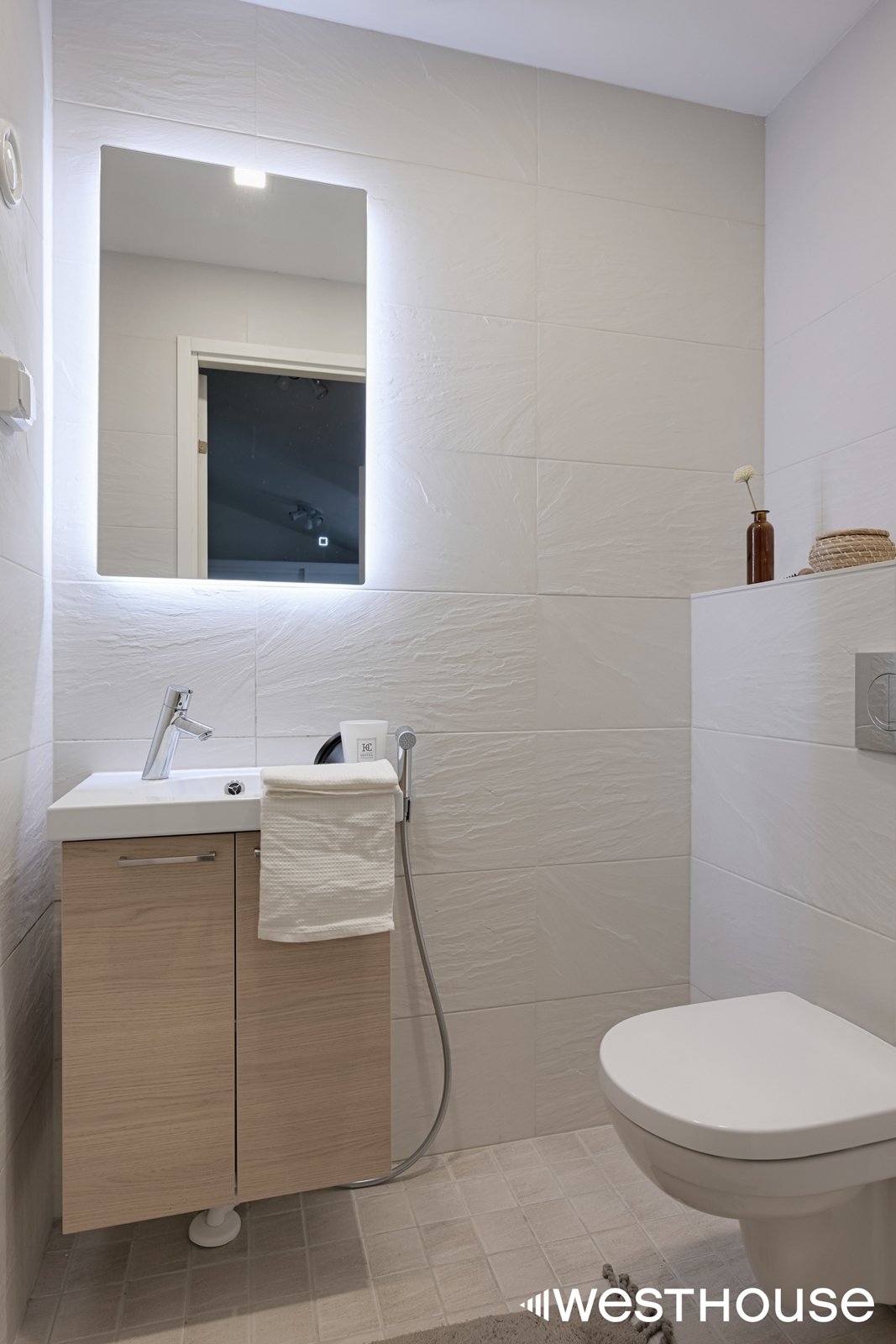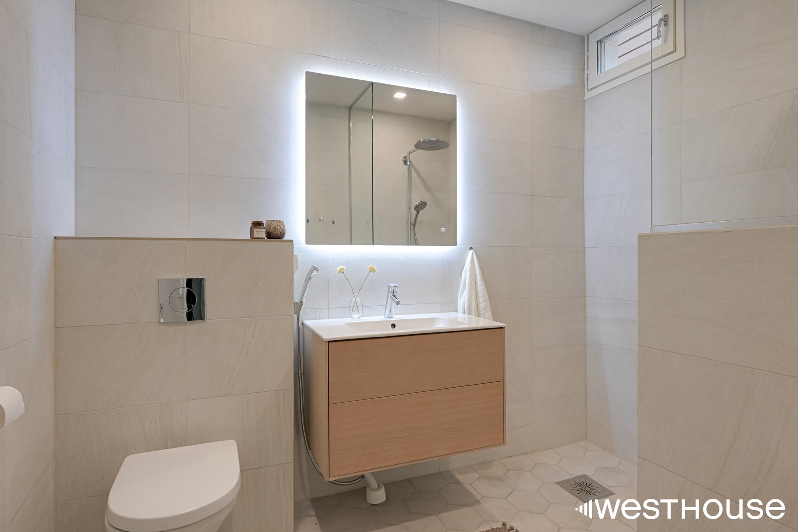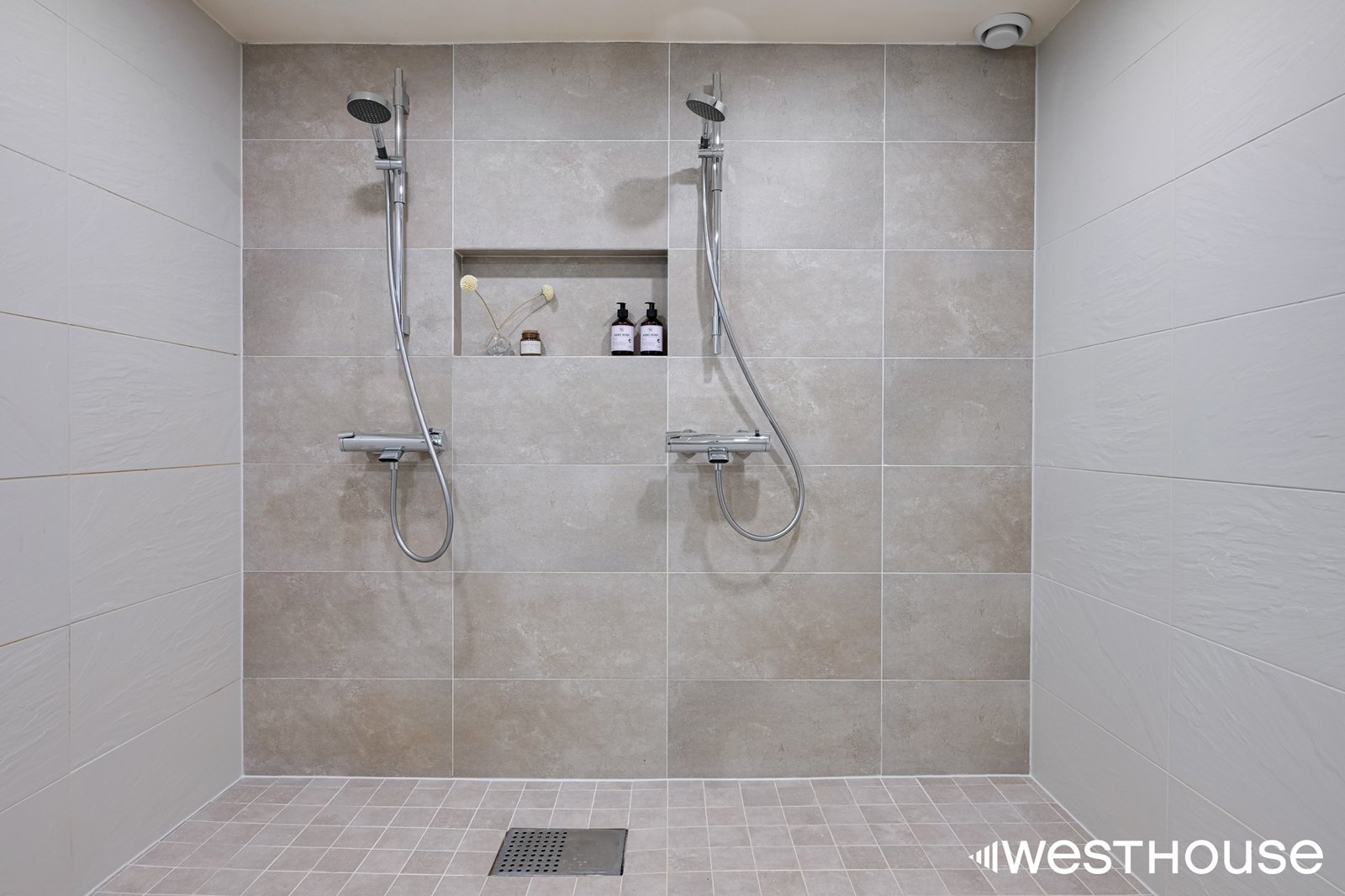 Huoneistossa on vuonna 2020 uudistetut kaksi kylpyhuonetta ja erillinen WC. Yksi kylpyhuone sijaitsee ylimmässä kerroksessa ja saunatilojen yhteydessä oleva kylpyhuone, jossa kaksi suihkua sijaitsee kellarikerroksessa. Lisäksi erillinen WC sisääntulokerroksessa.