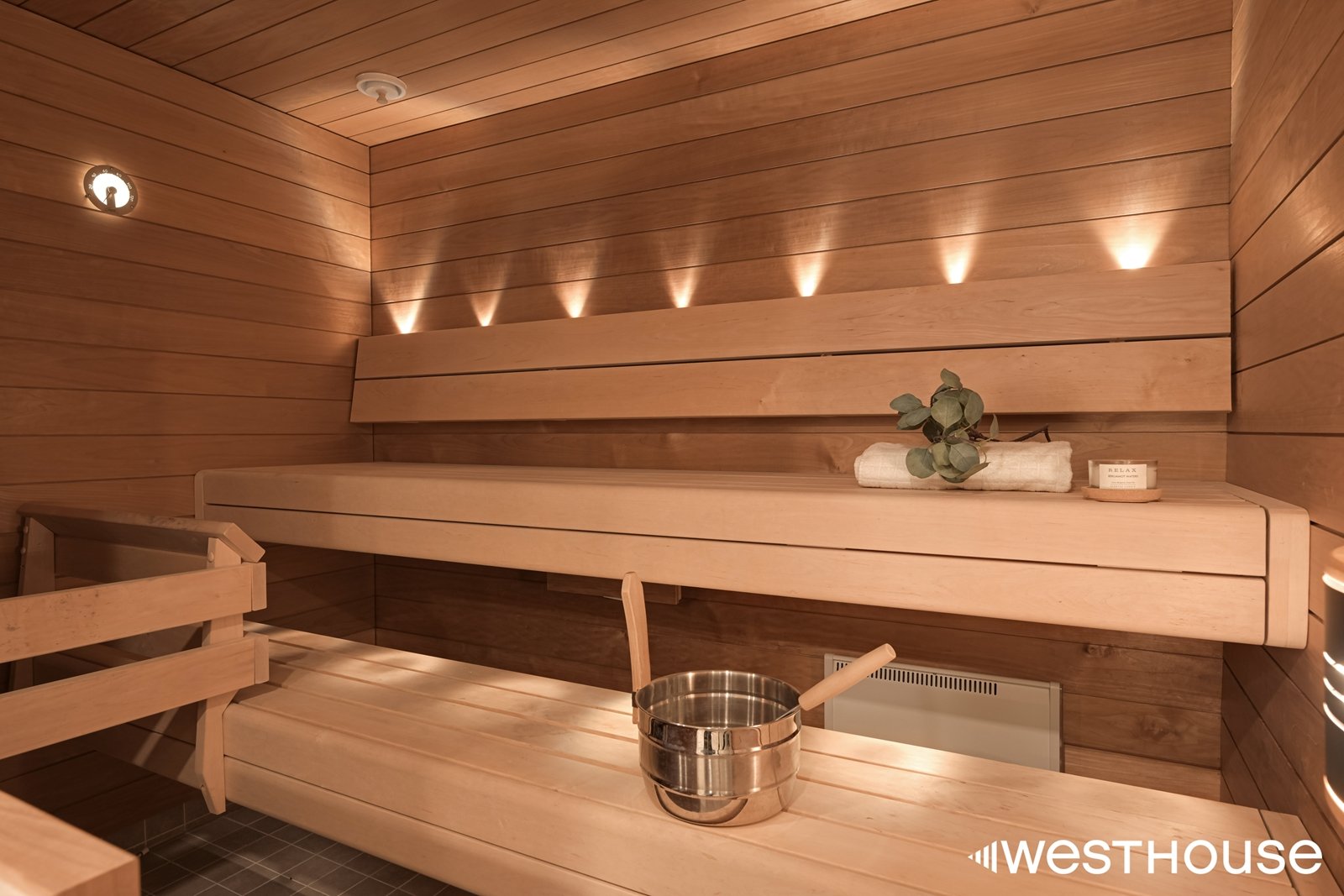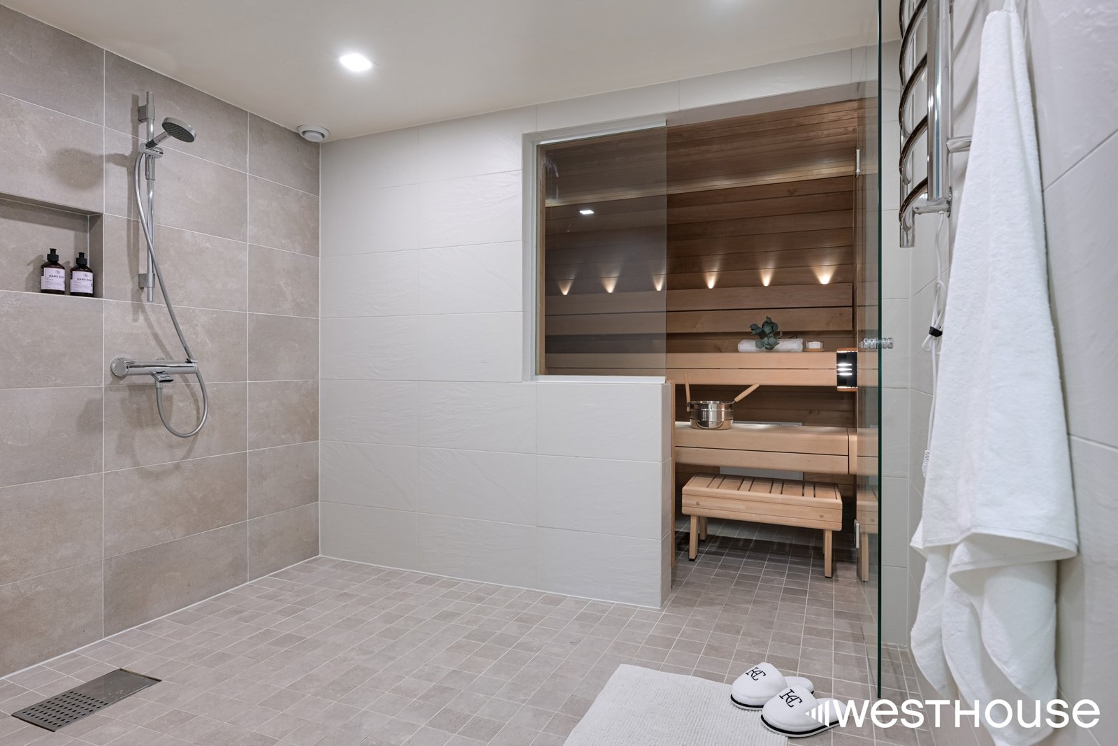Kaunis sauna uudistettu vuonna 2020 ja uudelleen paneloitu vuonna 2025. Saunatiloissa kaksi suihkua.