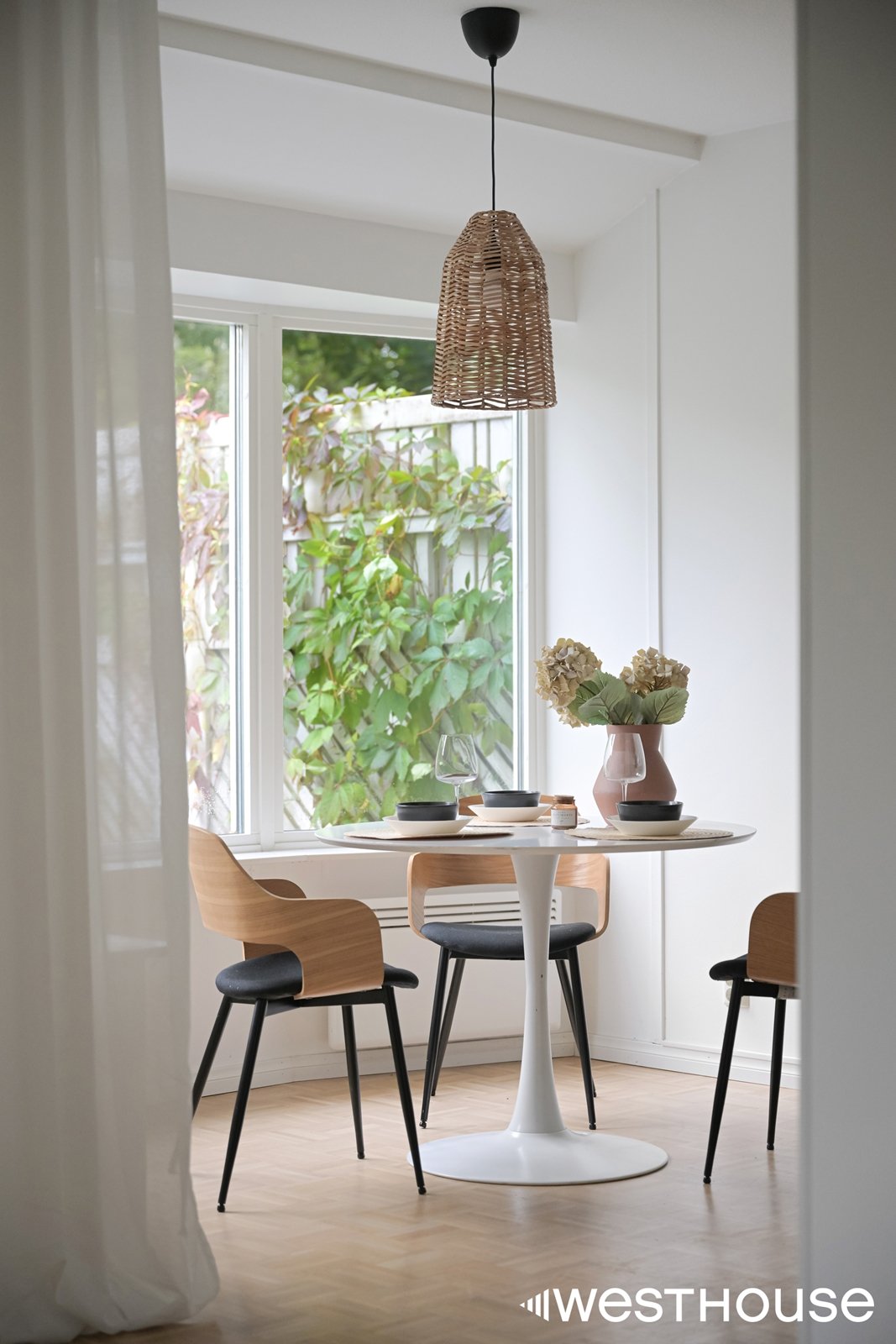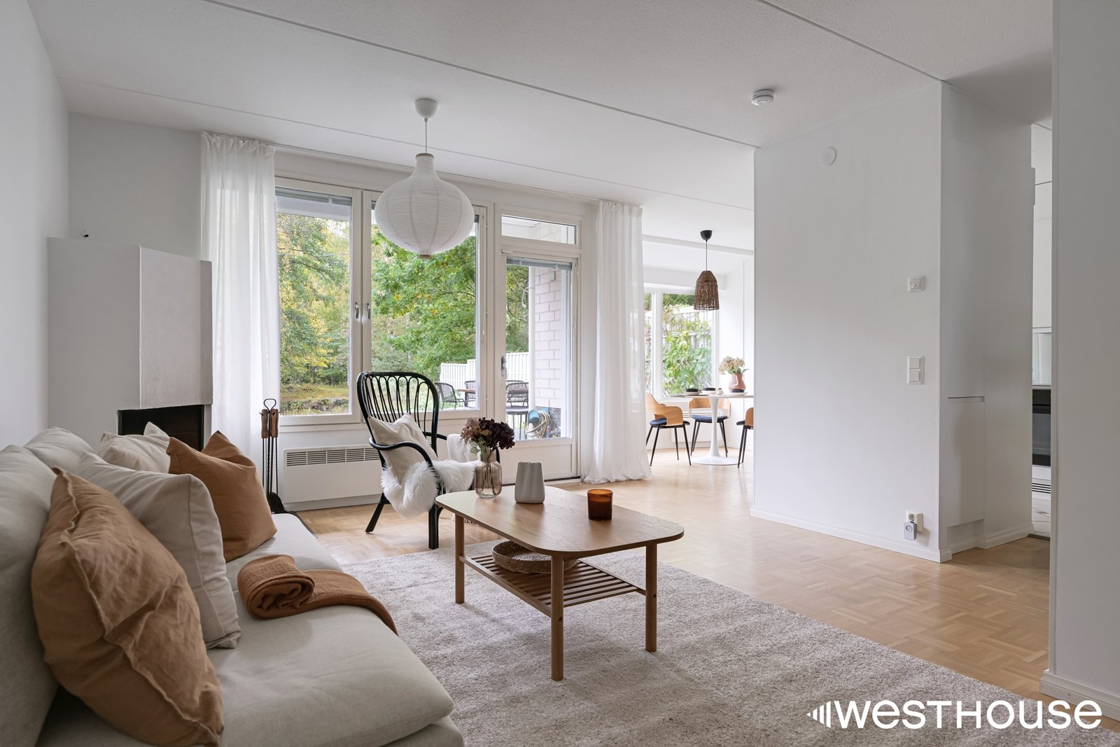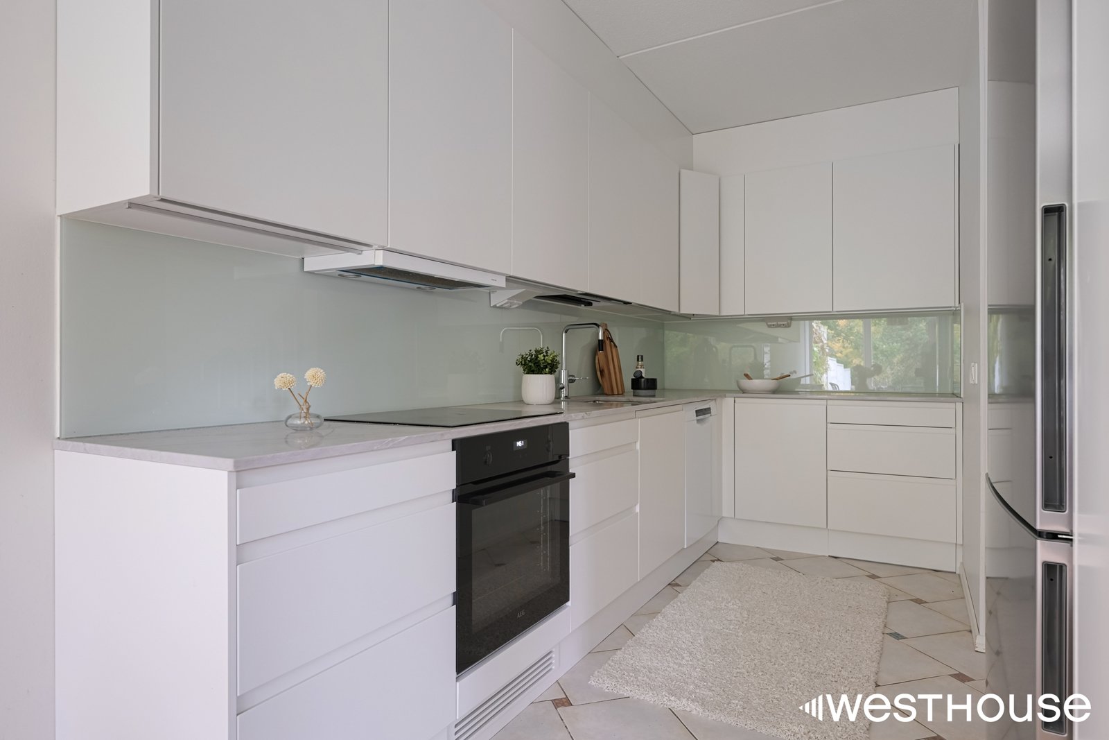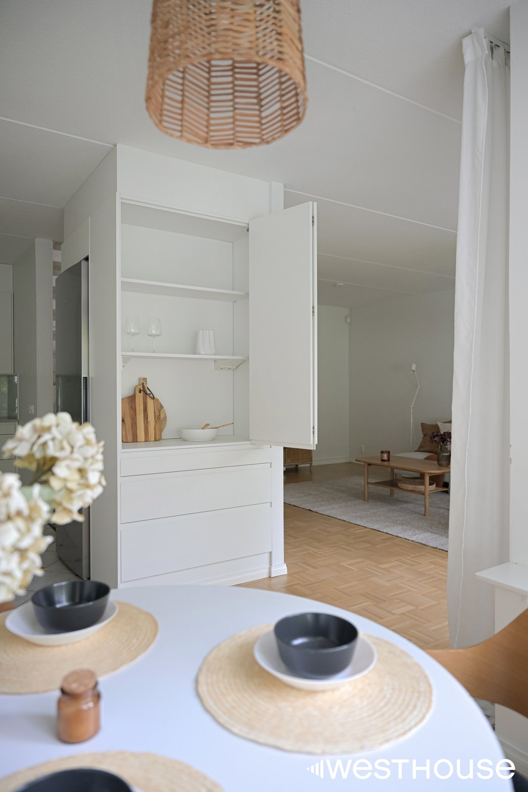 Vaalea vuonna 2024 uudistettu avokeittiö yhdistyy saumattomasti ruokailutilan ja olohuoneen kanssa. Keittiössä on kätevästi lasku- ja säilytystilaa sekä kaunis aamiaskaappi. Keittiöstä vehreät näkymät sekä uloskäynti huoneiston terassille ja pihalle,