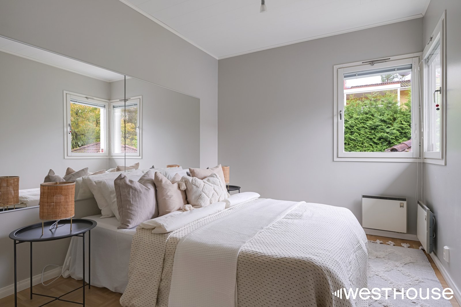 Kodin yläkerrassa sijaitsee kaksi reilun kokoista makuuhuonetta. Päämakuuhuoneessa on kätevä vaatehuone sekä käynti parvekkeelle. Yläkerrassa on myös toinen uudistettu kylpyhuone mikä helpottaa arkea.