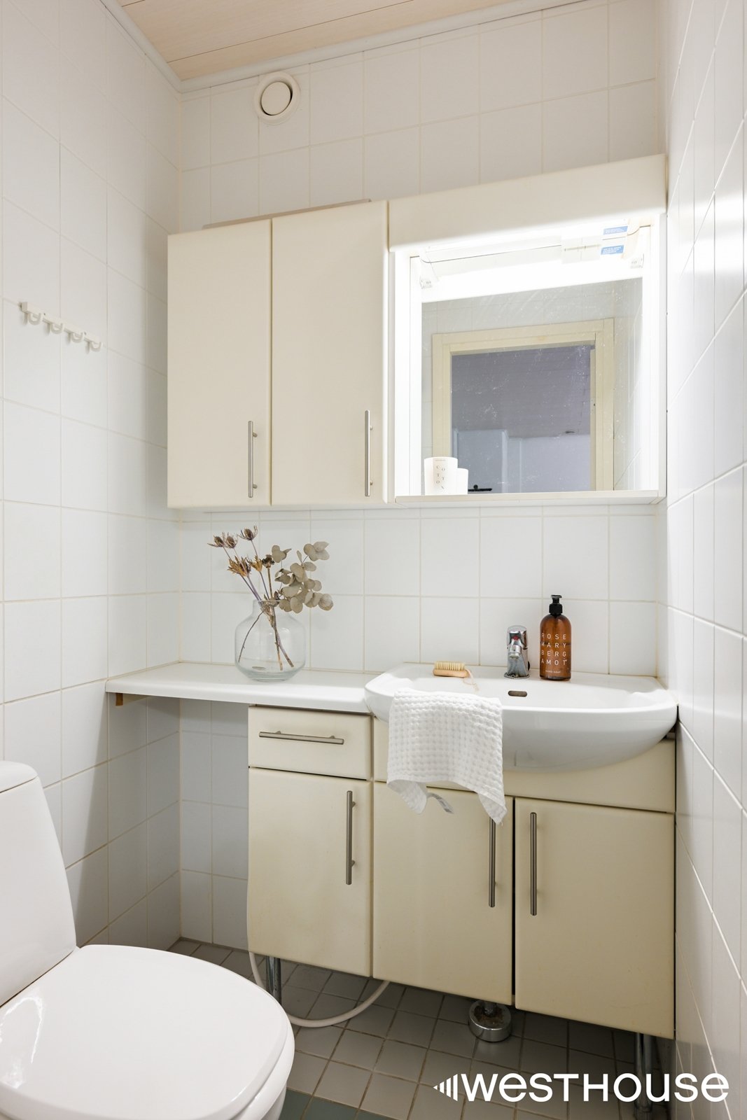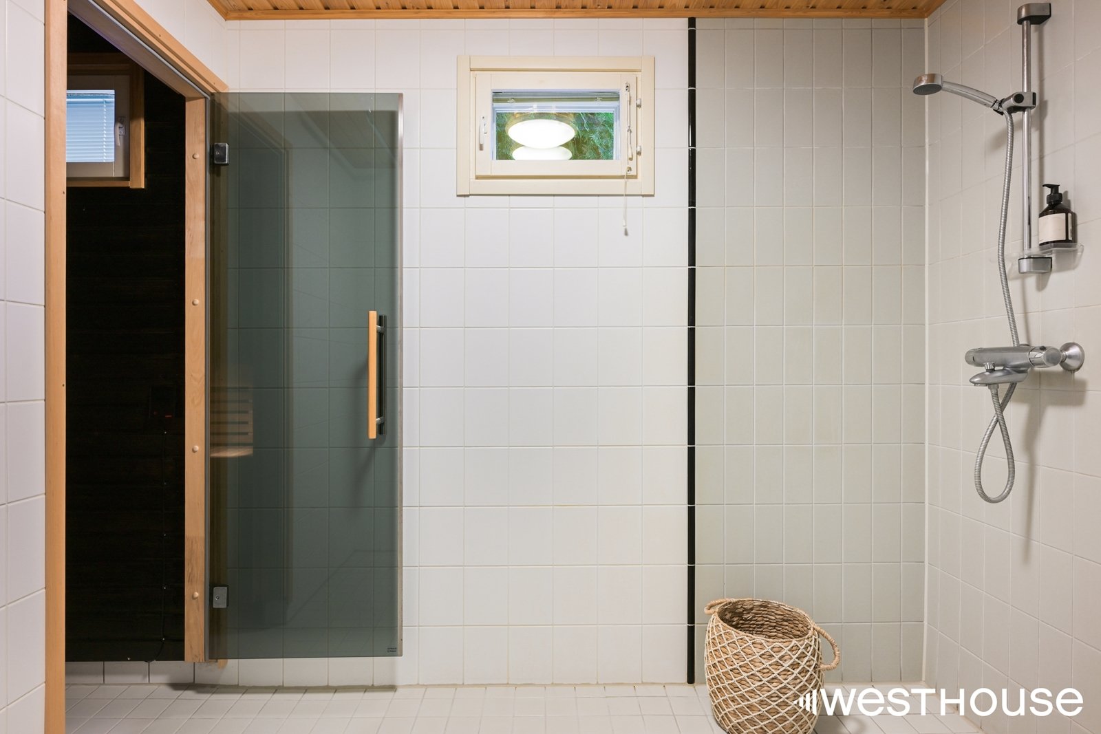 Yläkerran kylpyhuoneessa suihkukaappi, wc -istuin, bidee- suihku, allaskaappi, peilikaappi ja runsaasti säilytystilaa. Laattalattia, kaakeliseinät, lattialämmitys. Alakerran erillisessä wc -tilassa wc -istuin, bidee- suihku, allaskaappi, peilikaappi ja runsaasti säilytystilaa. Laattalattia, kaakeliseinät, lattialämmitys. Saunan yhteydessä sijaitsevassa pesuhuoneessa kaksi suihkua. Laattalattia, kaakeliseinät, lattialämmitys.