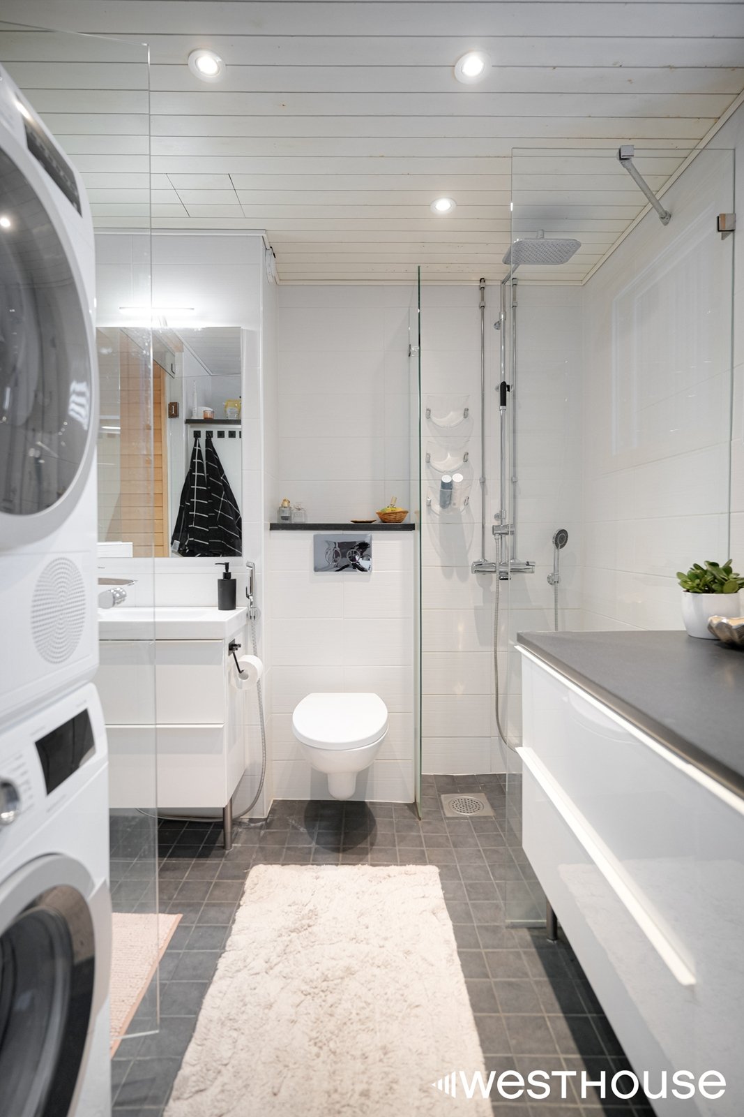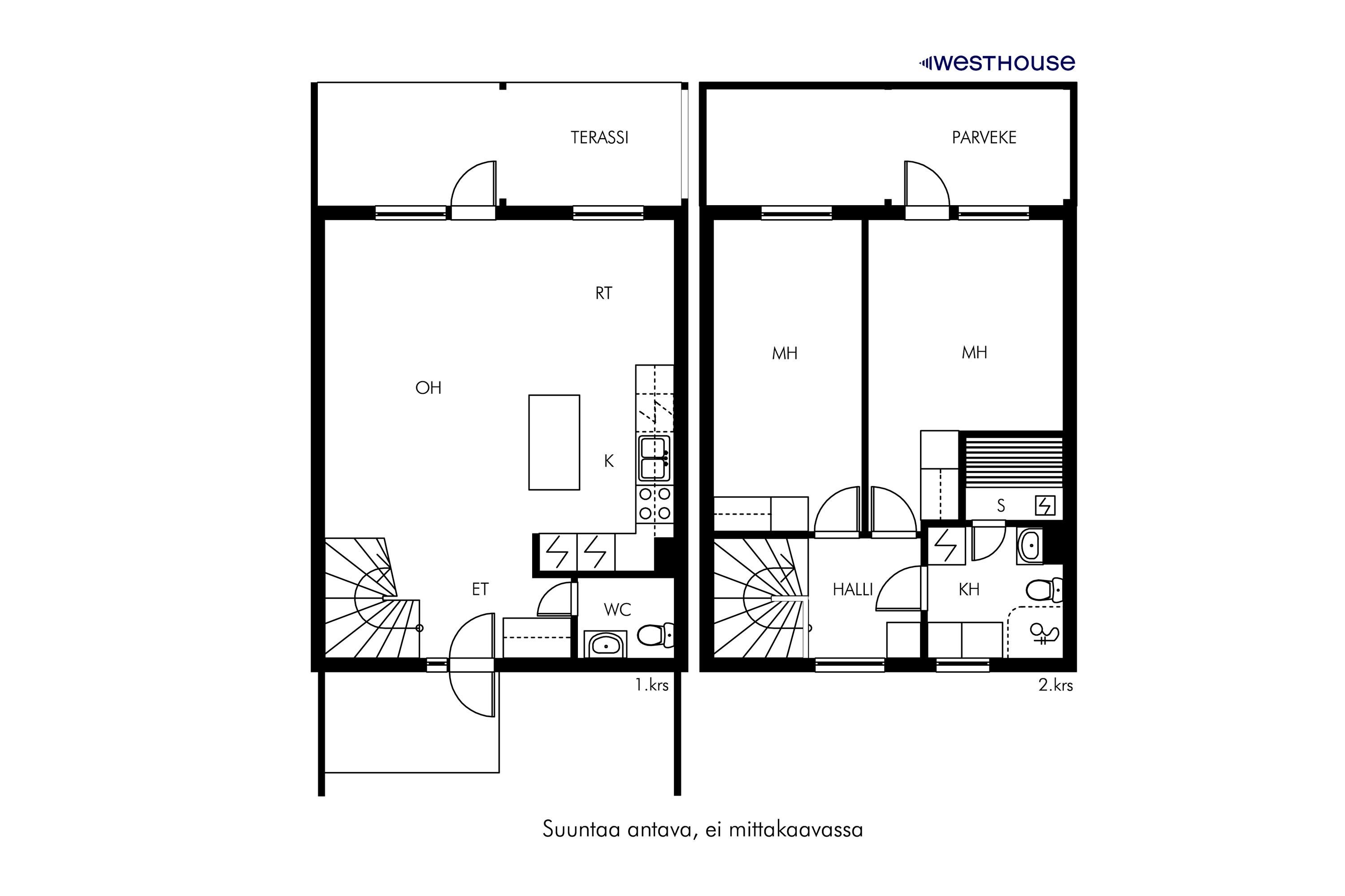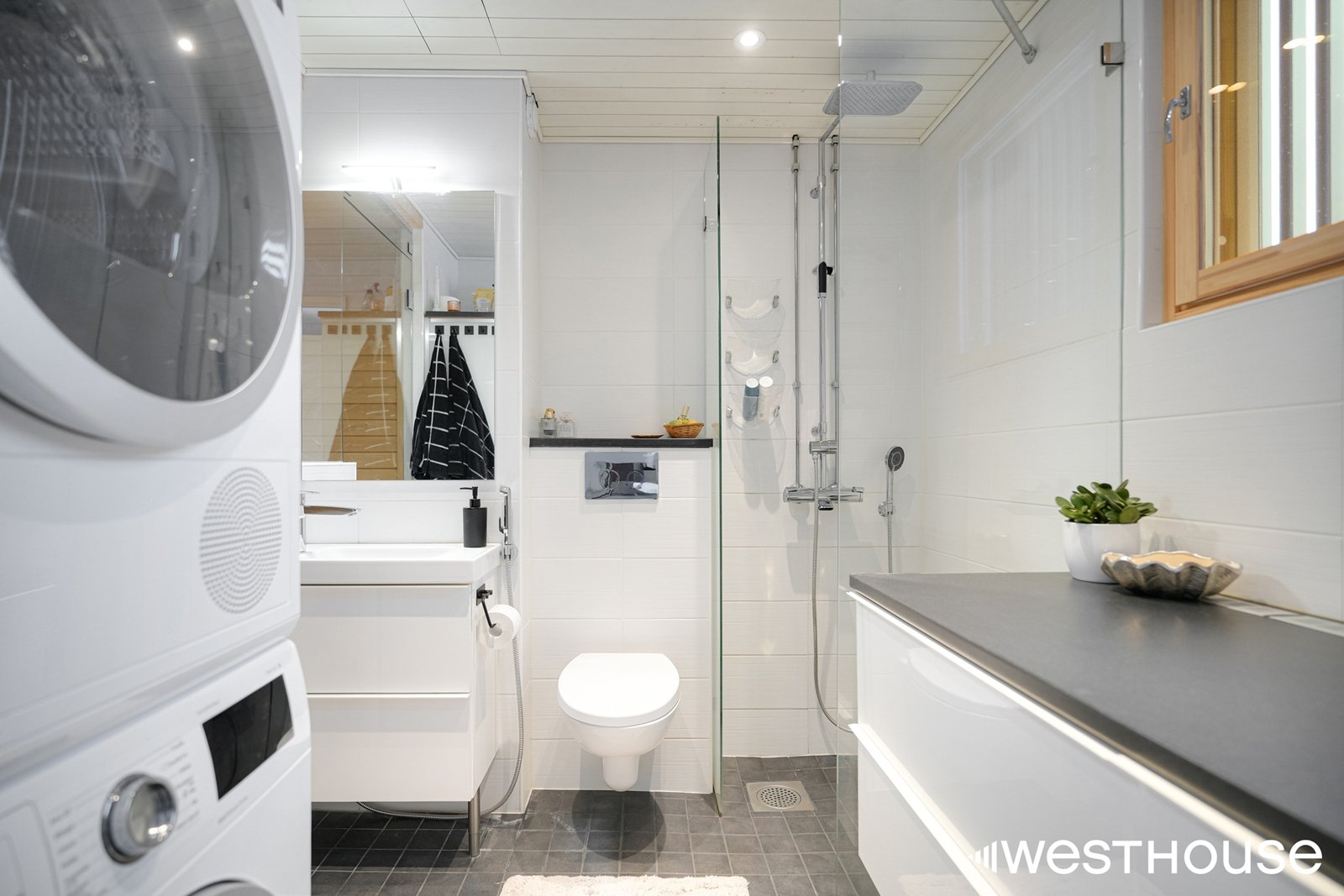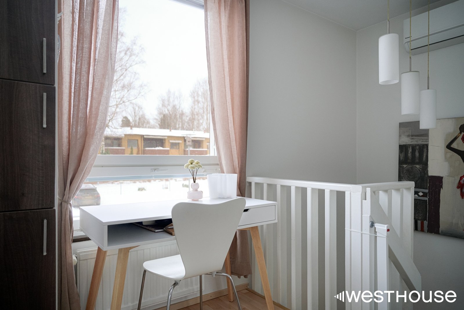 Tilat jakautuvat kätevästi kahteen tasoon. Alakerrassa on olohuone, avokeittiö, eteinen ja erillinen wc. Keittiössä on hyvin laskutilaa ja olohuone on helppo sisustaa. Omalla pihalla on terassia ja nurmikkoa.