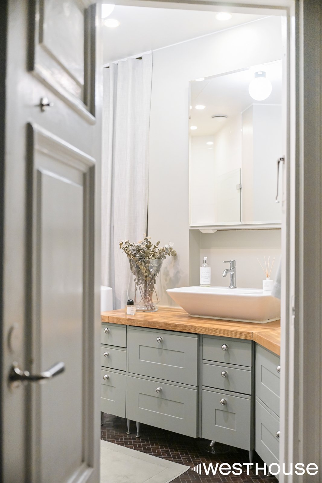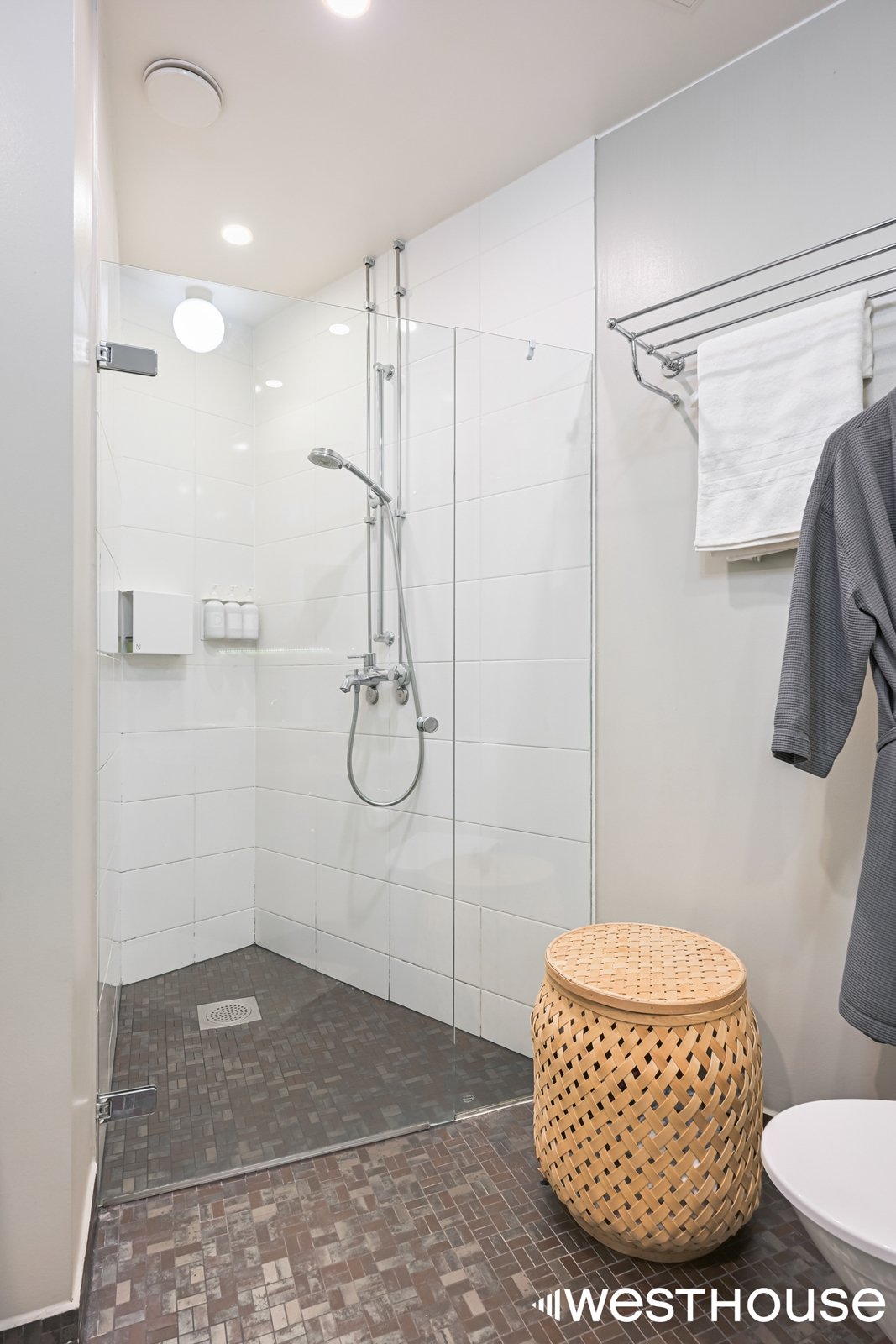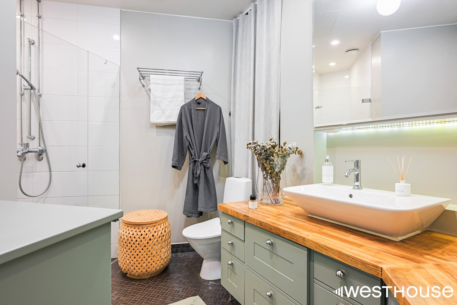 Tilava kylpyhuone/wc, jossa hyvin säilytystilaa, suihkunurkkauksessa lasiovi, lämmin pyyhepatteri, laskutason alla paikka pesukoneelle sekä iso peili. Lattia tyylikästä tummankirjavaa laattaa.