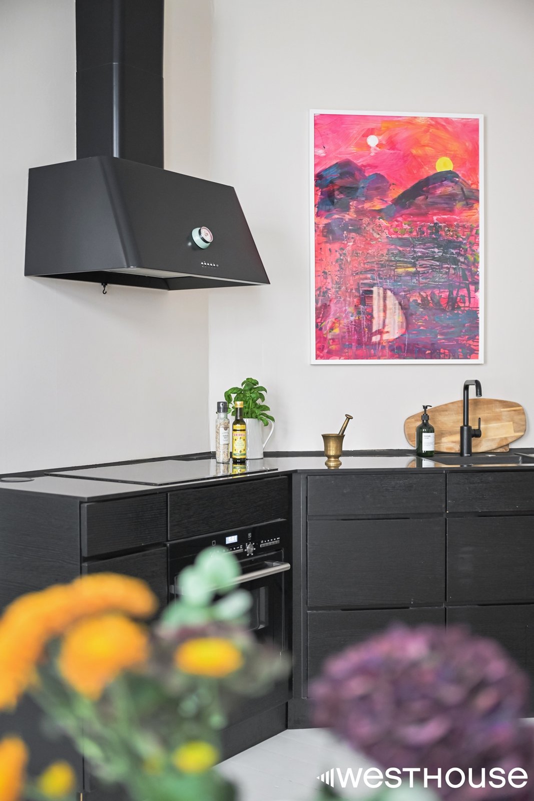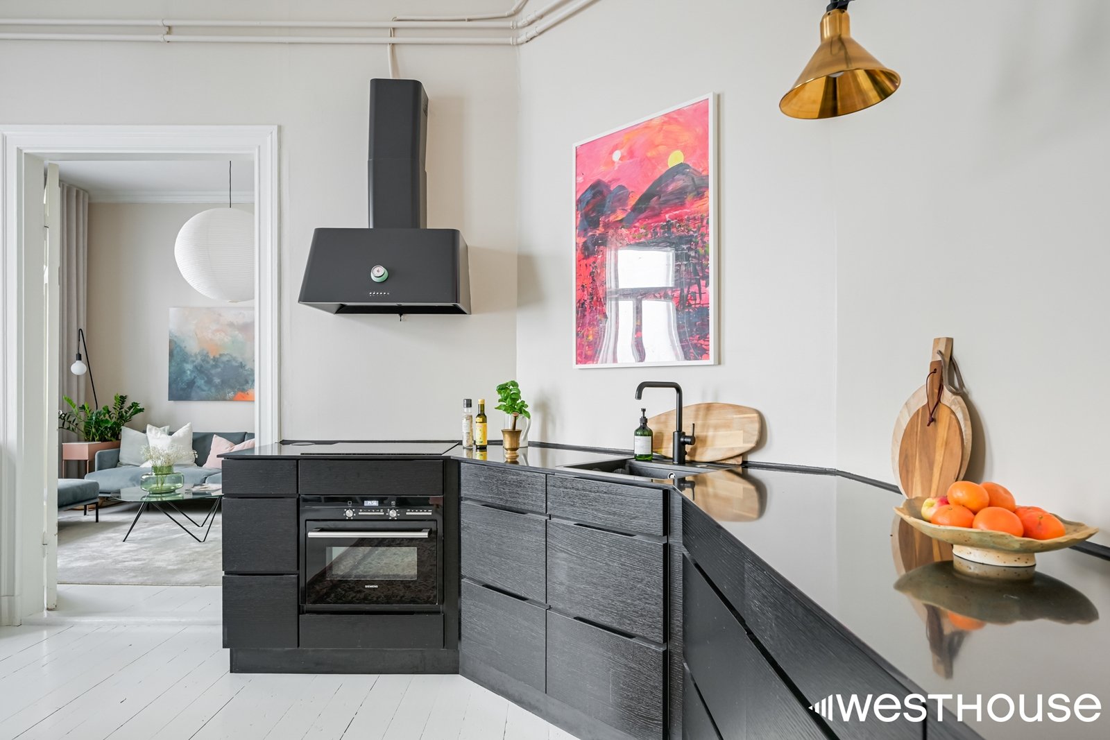 Upean tilavassa keittiössä on kauniit isot ikkunat, valkoinen näyttävä takka sekä tilaa isollekin ruokapöydälle. Keittiön alakaapistot ovat tummaa puuta ja tasot tummaa graniittia. Keittiön varustukseen kuuluu Siemensin induktioliesi ja uuni, Ilven musta liesituuletin, musta keraaminen tiskiallas ja hana, integroitu jääkaappi ja pakastin sekä kalusteeseen sijoitettu astianpesukone (40cm). Kylmälaitteet on sijoitettu kalusteeseen graniittitason alle.