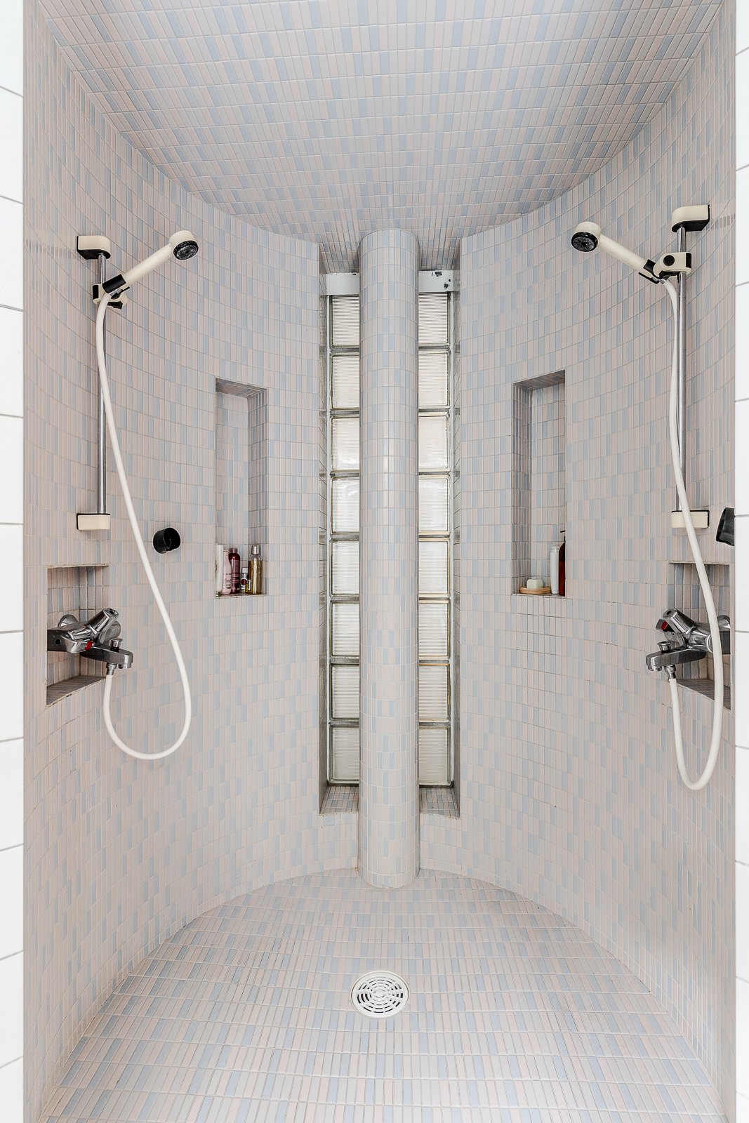 Spa-osasto jossa poreallas, yläkerrassa erillinen kylpyhuone. Tilat kokonaan kaakeloitu.