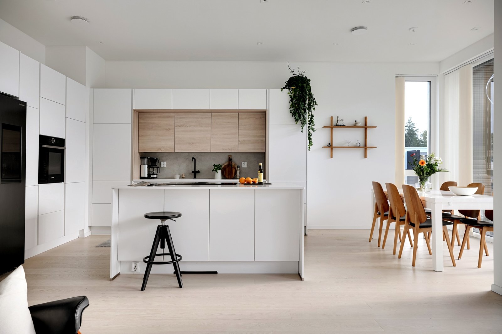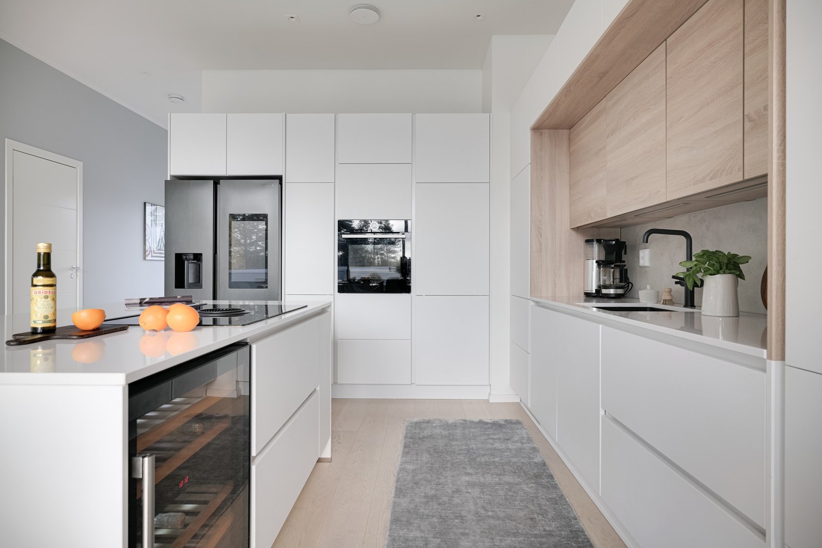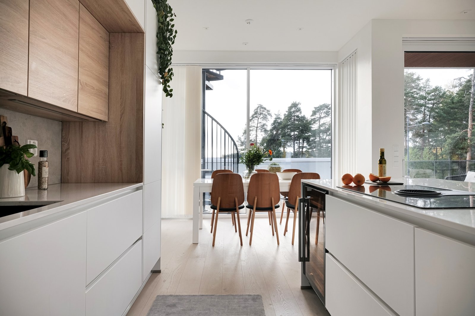 Tyylikäs valkoinen Noblessa- keittiö jossa kodikkuutta tuo osittain puun sävyiset ovet. Induktioliesi ja liesituuletin saarekkeessa, valoisa ruokailutila heti keittiön vieressä. Laadukkaat kodinkoneet, erillisuuni, astianpesukone, jääkaappi/pakastin ja viinikaappi. Tilassa Timberwise- tammilautaparketti, seinät maalatut.