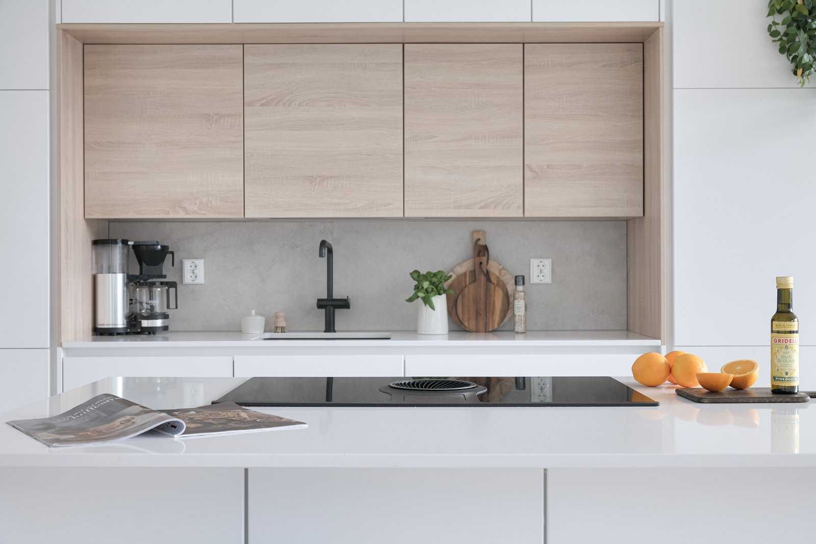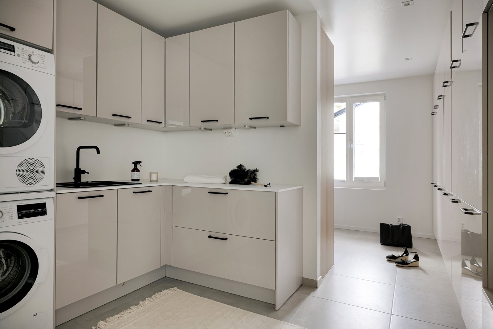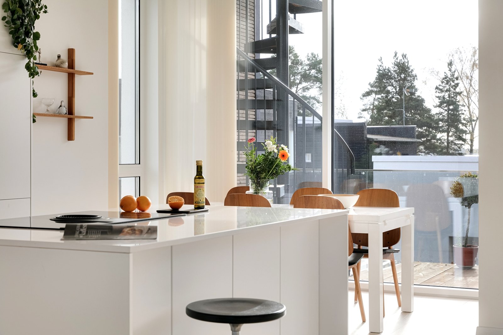 Tyylikäs valkoinen Noblessa- keittiö jossa kodikkuutta tuo osittain puun sävyiset ovet. Induktioliesi ja liesituuletin saarekkeessa, valoisa ruokailutila heti keittiön vieressä. Laadukkaat kodinkoneet, erillisuuni, astianpesukone, jääkaappi/pakastin ja viinikaappi. Tilassa Timberwise- tammilautaparketti, seinät maalatut.