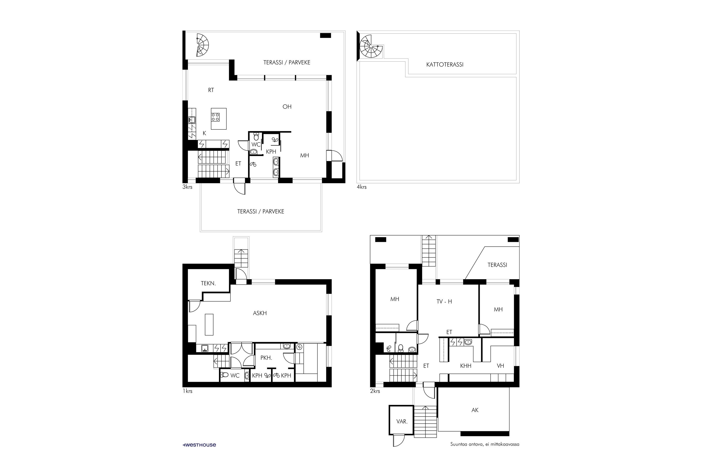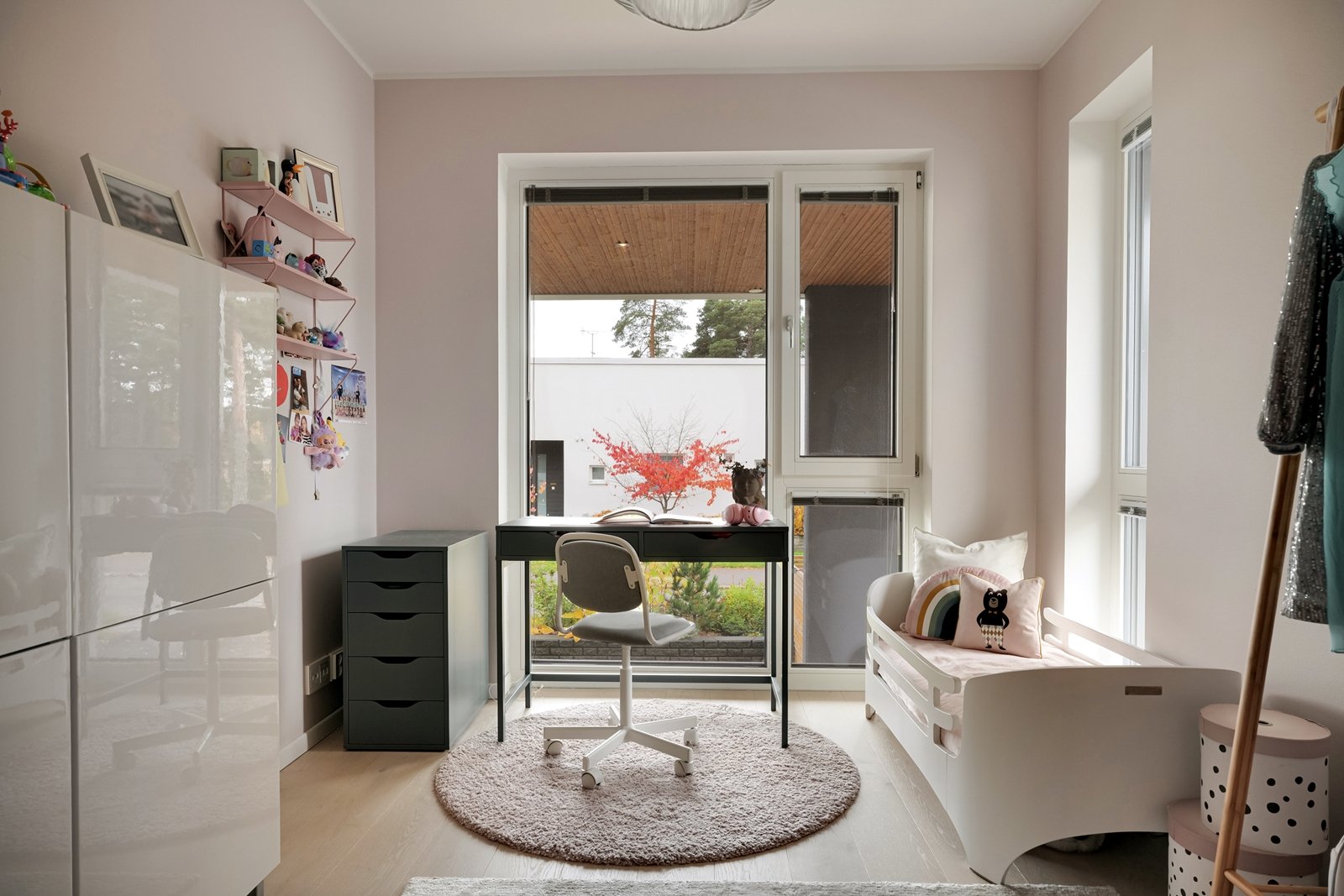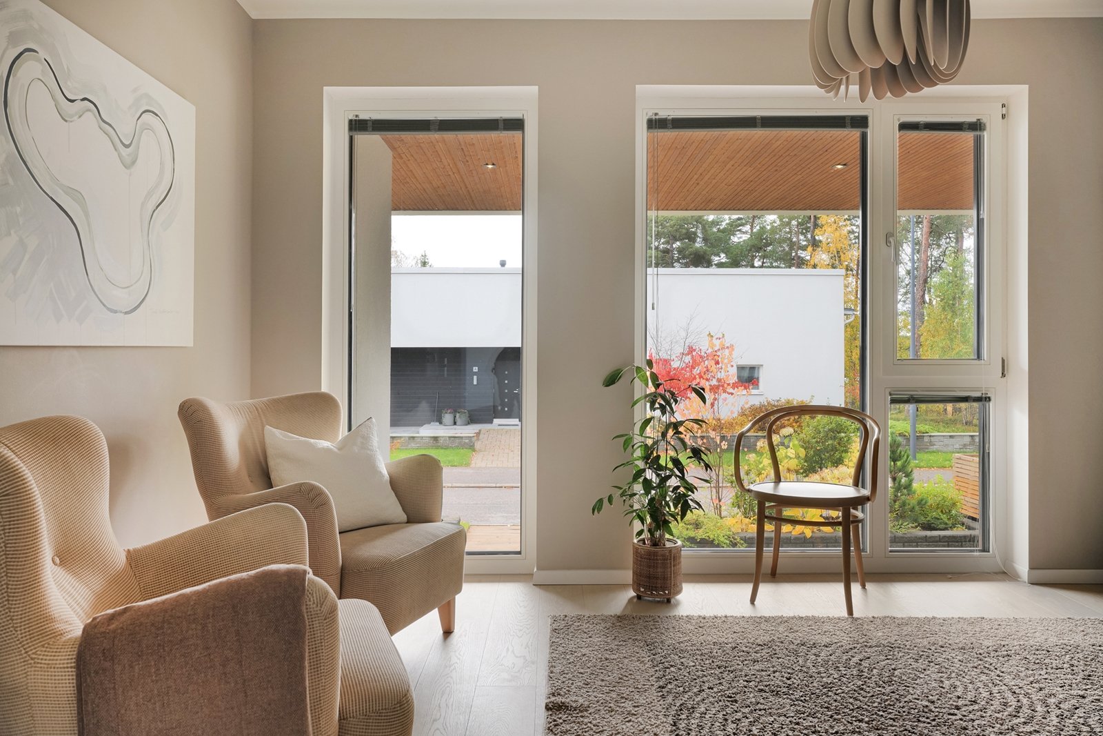 Kolmikerroksinen koti on suunniteltu arjen ja juhlan tarpeisiin. Toisen kerroksen avara olohuone, moderni keittiö ja kaksi tilavaa terassia muodostavat kodin sydämen, jossa nautitaan aamukahveista, illallisista ja yhdessäolosta. Makuuhuoneet sijaitsevat omassa rauhassaan keskikerroksessa, ja tarvittaessa saat helposti lisätilaa yhdelle huoneelle. Alimmassa kerroksessa odottaa rentouttava saunaosasto sekä monikäyttöinen askartelutila, jossa on tyylikäs baarikeittiö – täydellinen paikka illanviettoihin tai harrastuksiin.