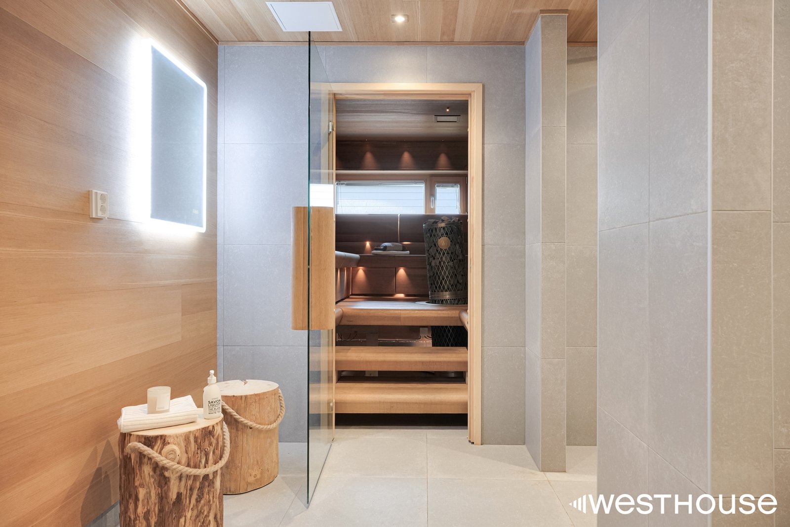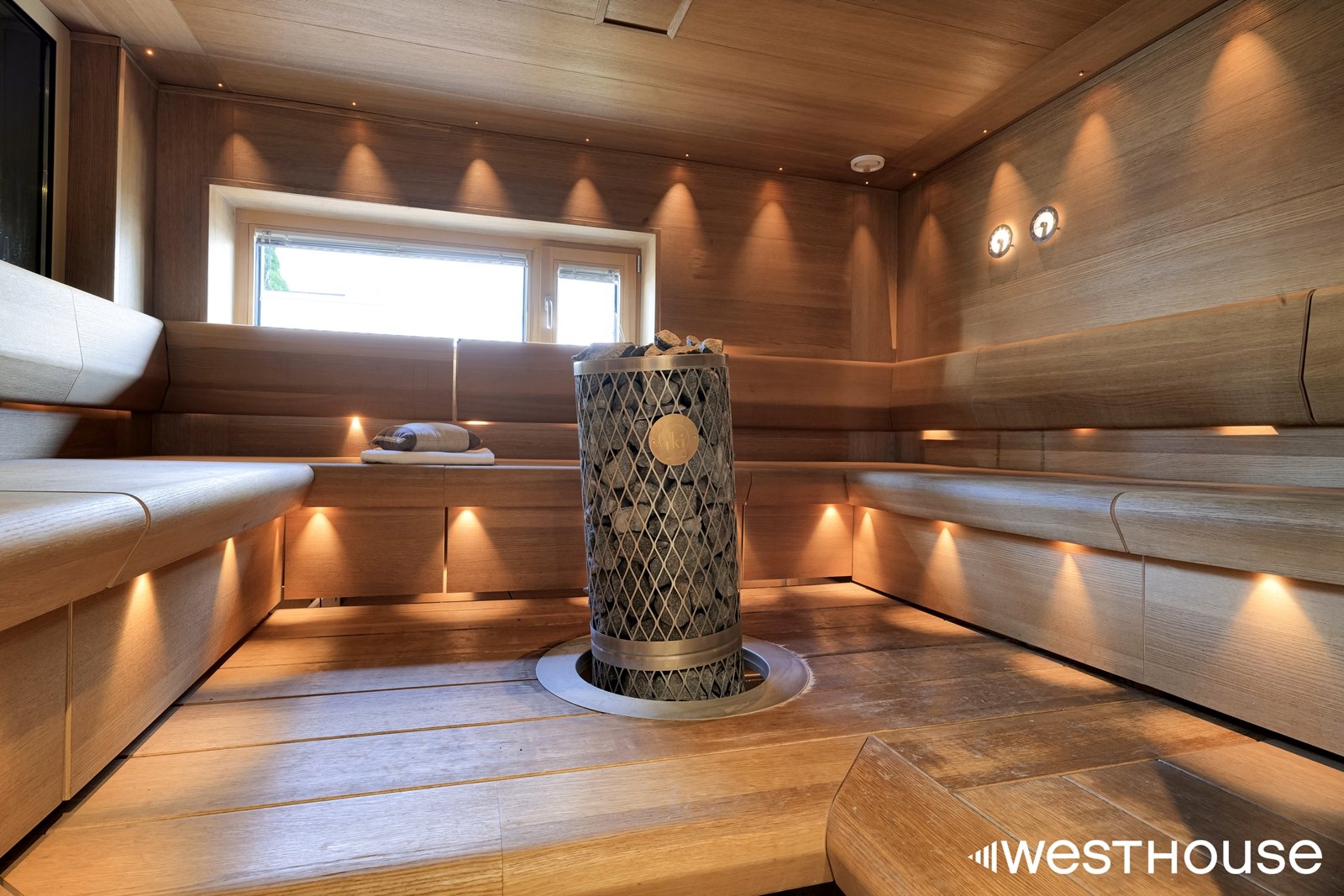 Upea ja tilava sauna, josta ikkuna alakerroksen oleskelutilaan, ikkuna myös ulos. Kauniit Taive- lauteet ja pilarikiuas.
