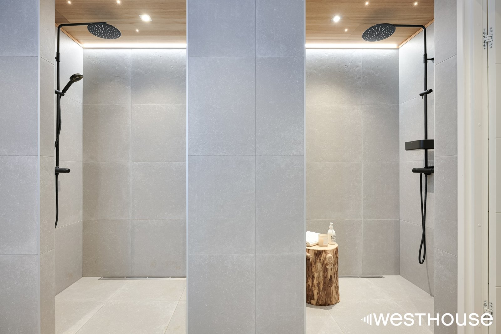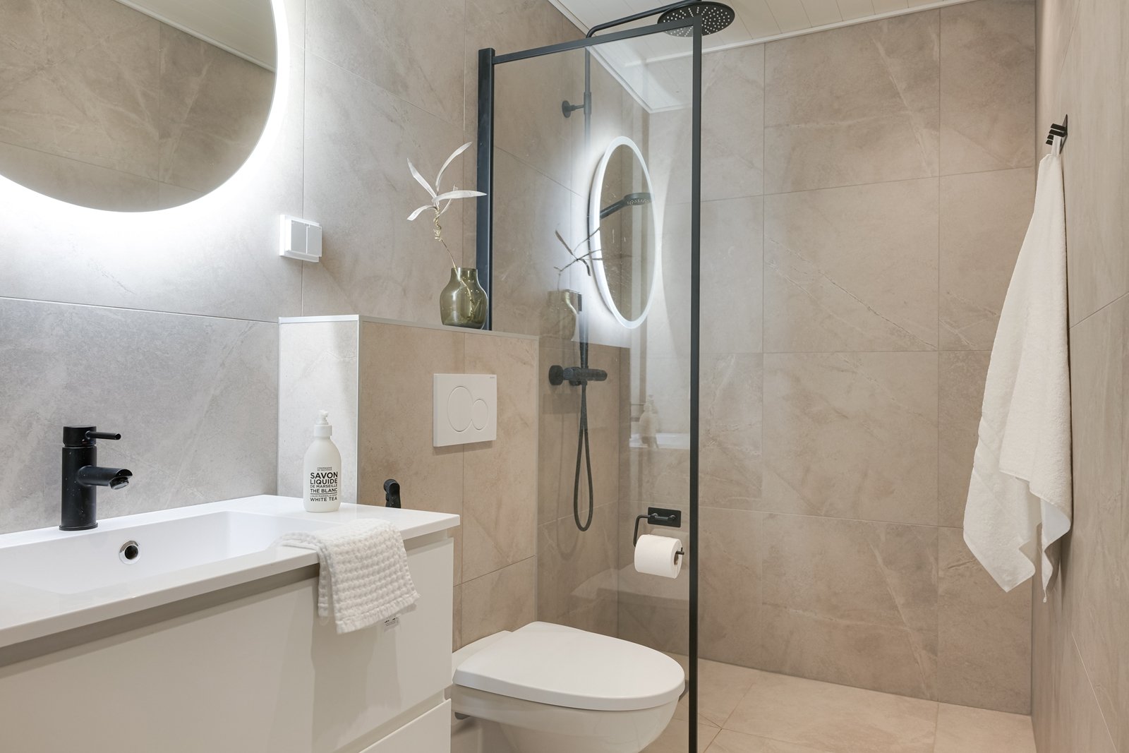 Talossa on kylpyhuone kaikissa kerroksissa, ylimmän kerroksen kylpyhuoneessa on valmius kylpyammeelle. Tilat on laadukkaasti kalustettu.