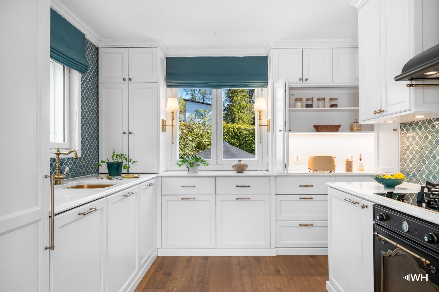 Upea mittatilaus keittiö Amelialta: keittön ovet koivua kehykset massiivipuuta peiliosa viilua - Josadoorin valmistamat. Työtaso on upeaa Calacatta Gold Kvartsia ja seinälaatat upean aquan väriset. Lattiassa kaunis rustiikin mallinen Kährsin leveä lautaparketti. Keittiön sydän on Smegin Induktio-kaasuliesi. Keittiön toimivuutta lisää kaksi vesipistettä.