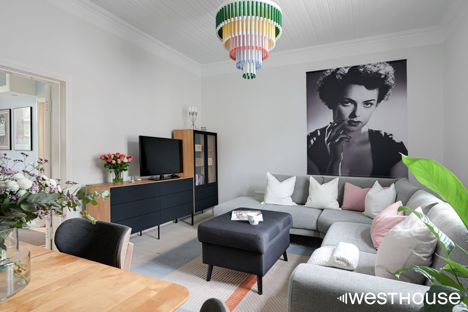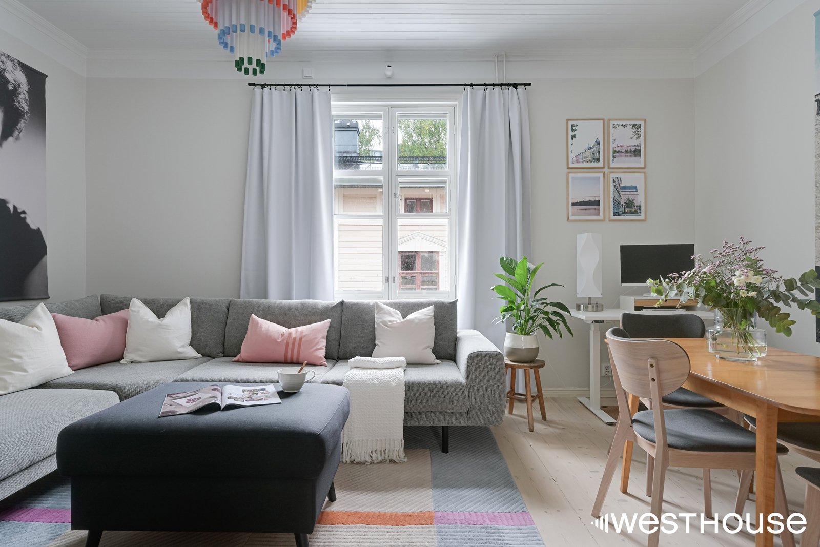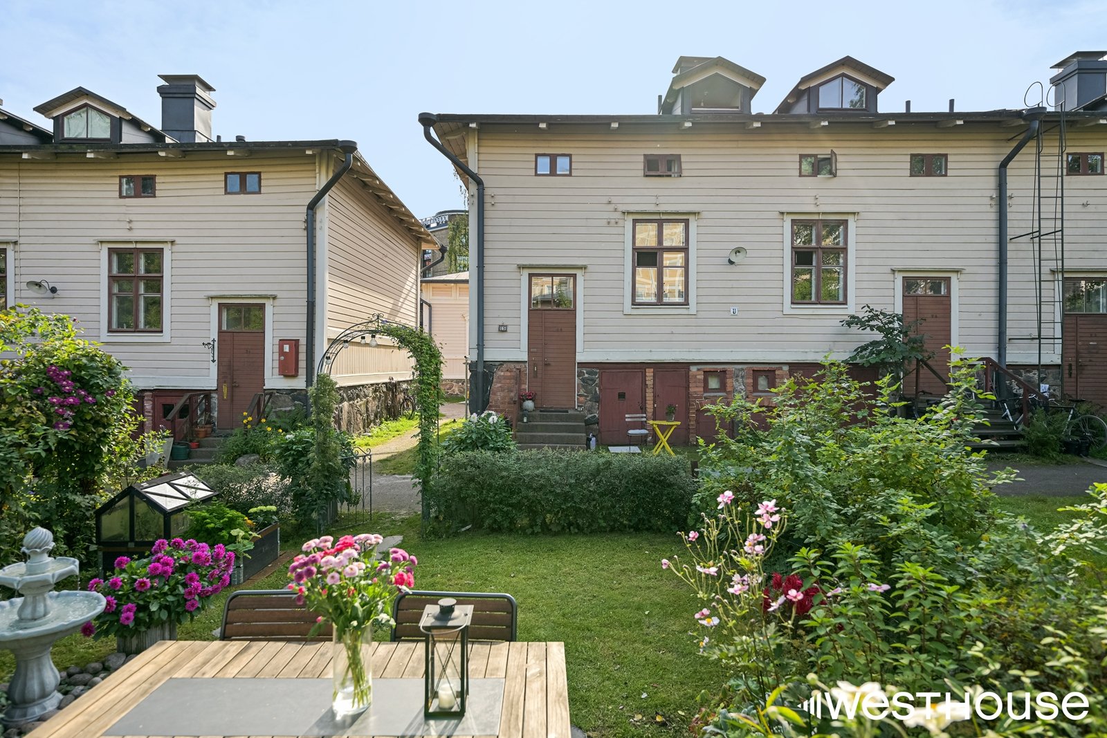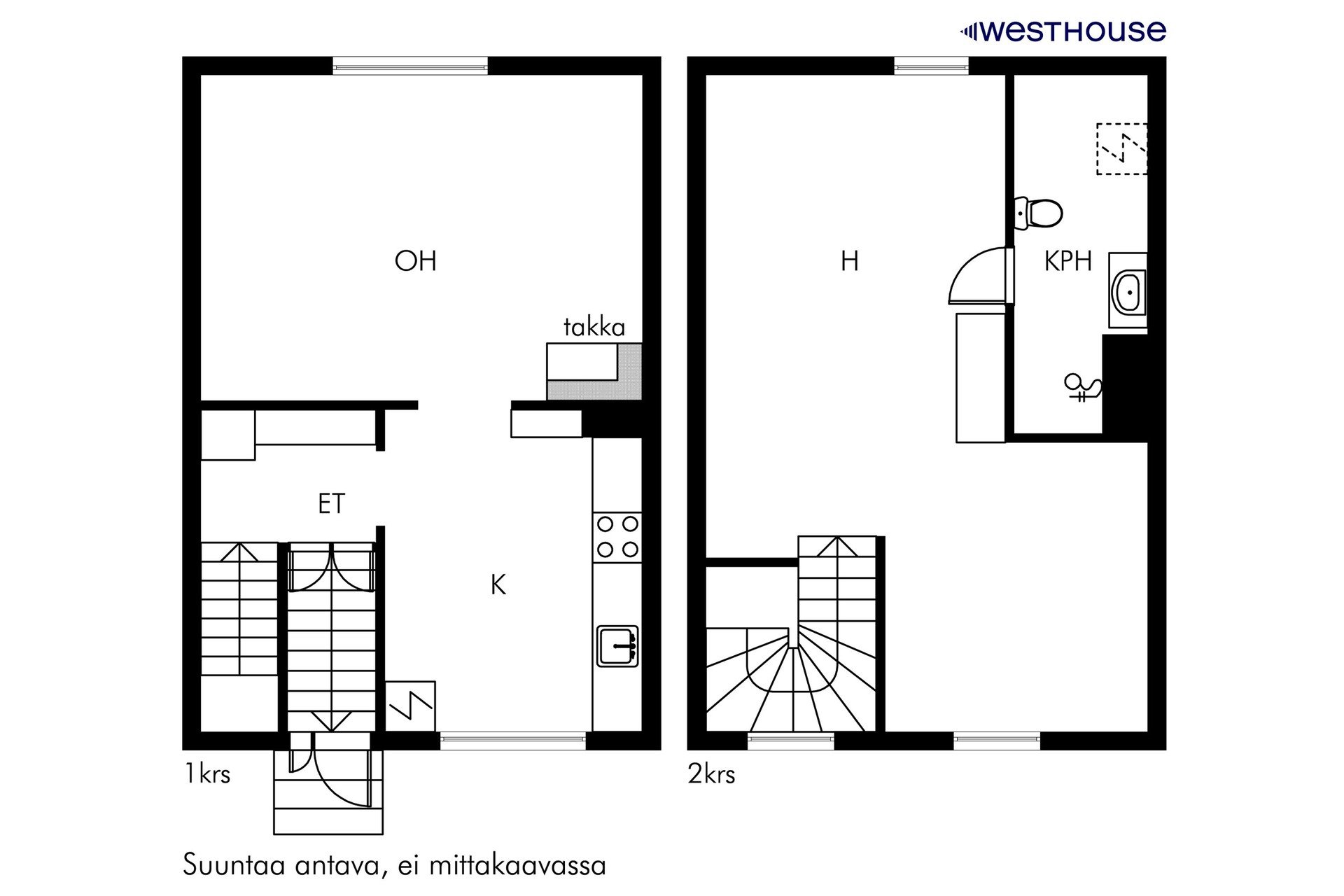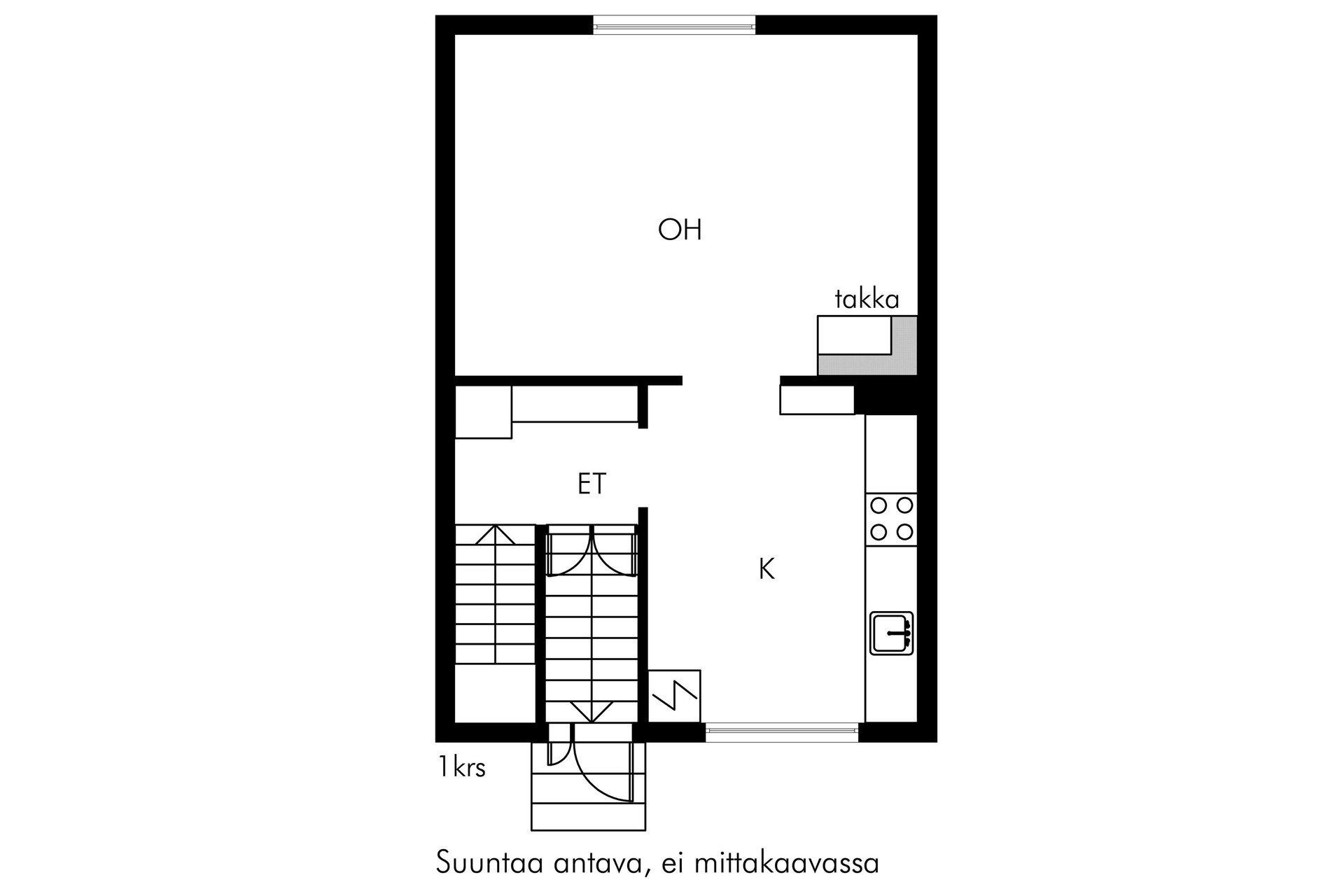 Nyt myynnissä on ihastuttava kaksikerroksinen 54 neliön rivitalokaksio. Lattiapinta-alaa on lähemmäs 70 neliötä, matala tila huomioiden. Ensimmäisessä kerroksessa sijaitsevat olohuone ja keittiö. Lähes kolmen metrin upea huonekorkeus luo juhlavaa tunnelmaa isojen ikkunoiden tarjotessa kaunista luonnonvaloa. Olohuoneessa komeilee syvän vihreä kaakelikakluuni. Keittiössä on tyylikkään ajaton ilme, jossa valkoiset kaapistot yhdistyvät murrettuun ruskeaan keittiön kivitason ja välitilan kangaskaakelin kanssa.