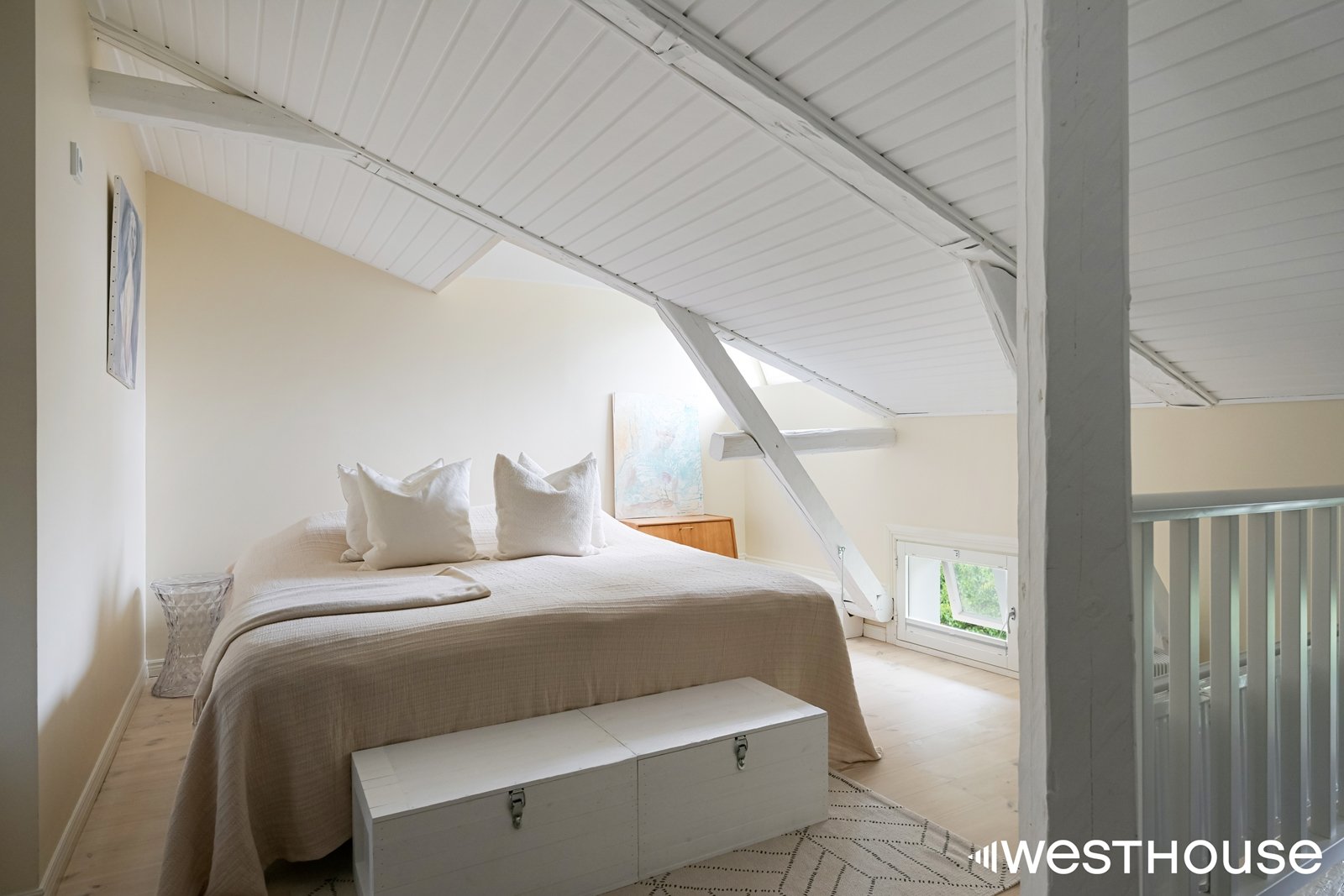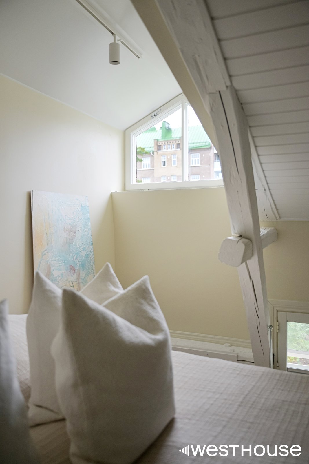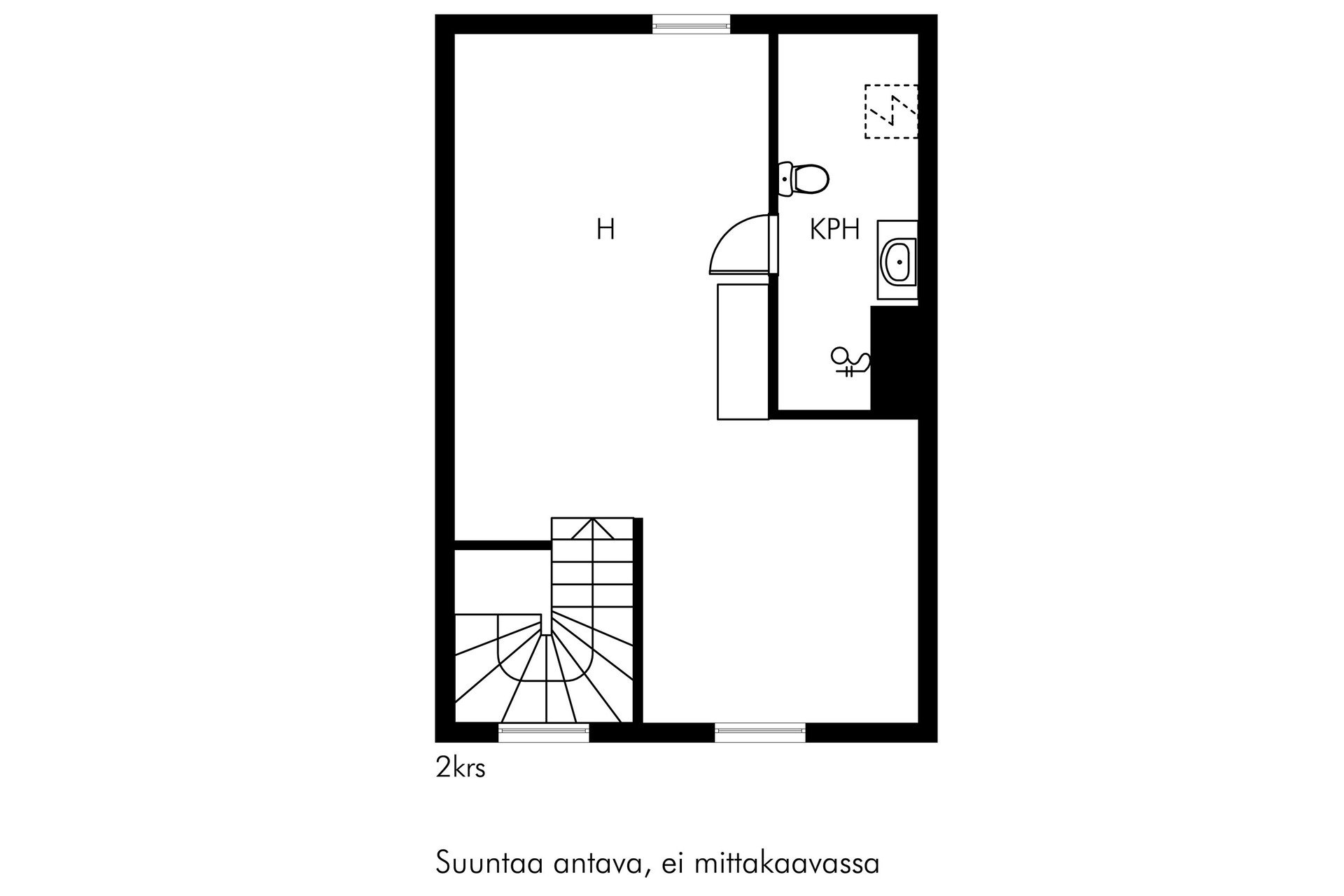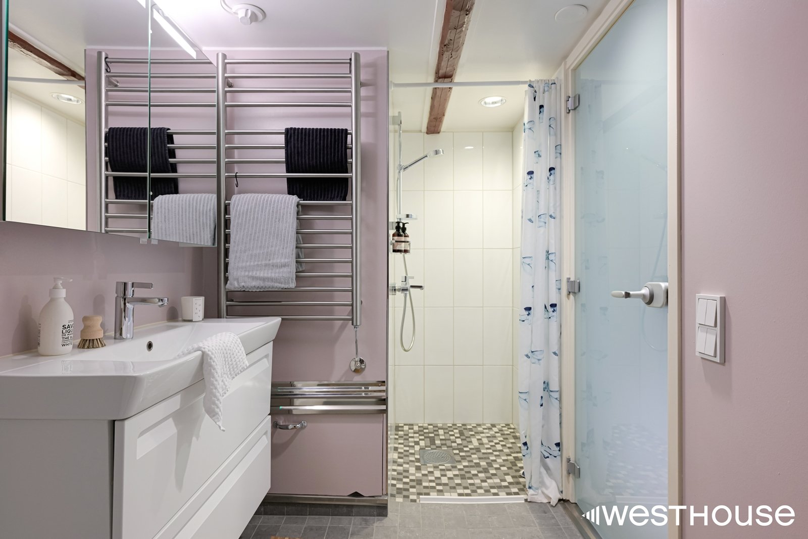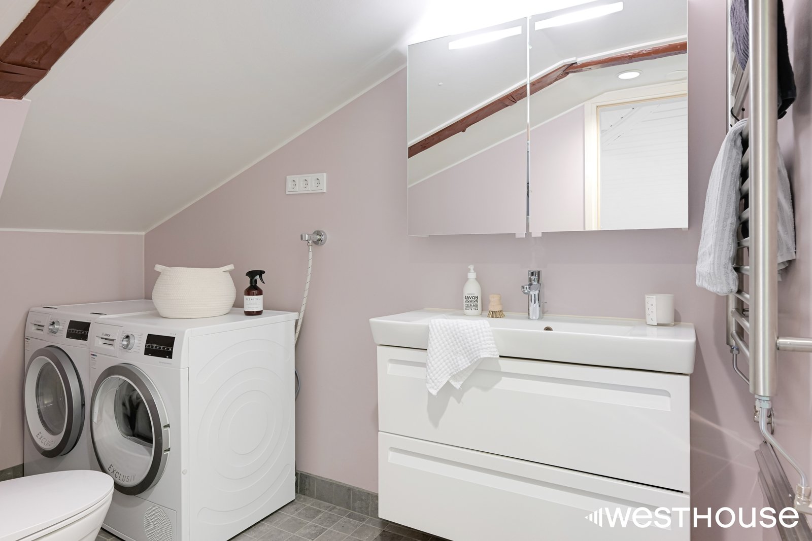 Asunnon yläkerrassa on makuuhuone ja tilaa vaikka lastenhuoneelle. Tyylikkäästi aikanaan remontoitu kylpyhuone sijaitsee yläkerrassa.