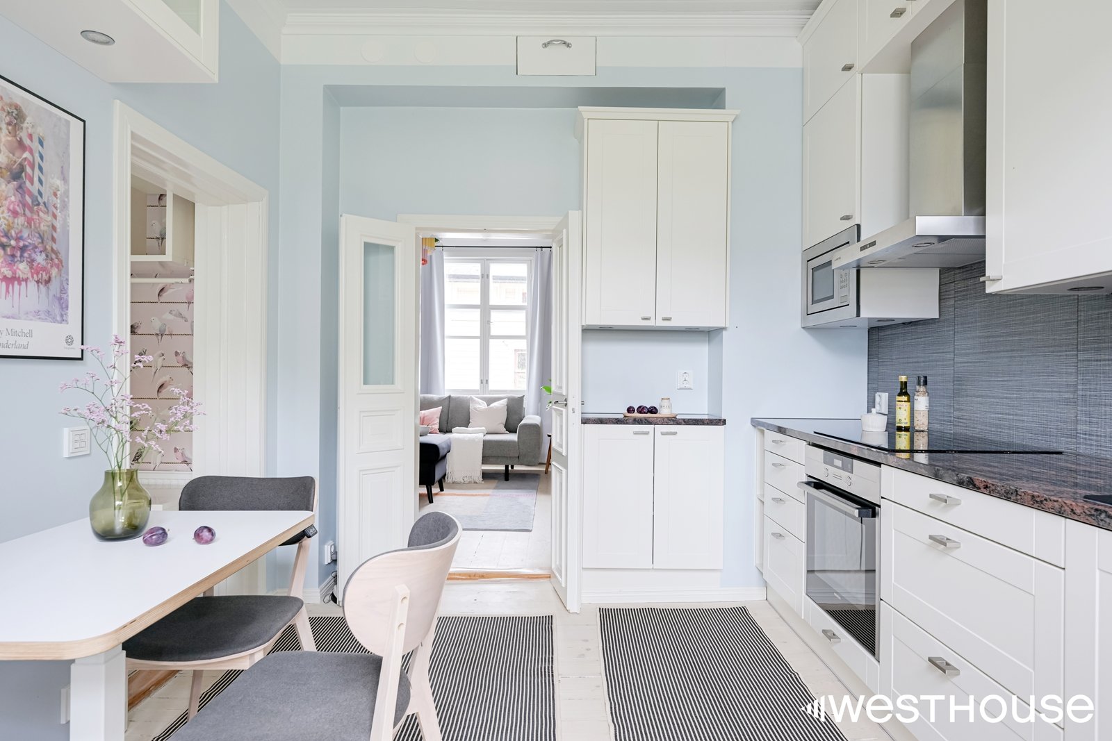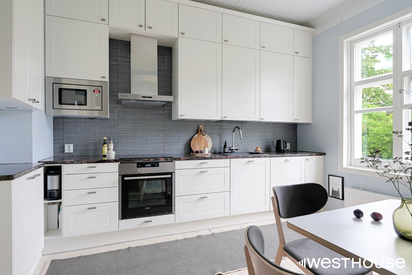 Keittiössä on ajattoman tyylikkäät Puustellin valkoiset kaapistot ja 2023 lipeöity puulattia (läpikuultava valkoinen). Mustanruskea kivitaso ja välitilan tumma kangaskaakeli viimeistelevät tyylikkään ja hormonisen ilmeen keittiöön. Keittiöstä löytyy kaikki kodinkoneet: induktioliesi, Blancon musta komposiittiallas, rosterinen Lapetek liesituuletin (aktiivihiili) sekä integroitu astianpesukone (Siemens).