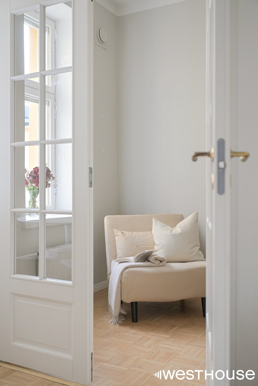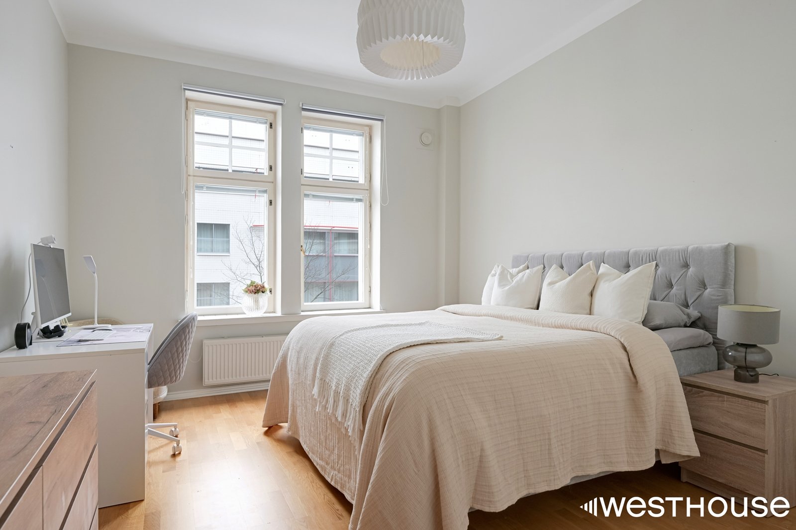 Asunnossa on kaksi makuuhuonetta, joista suuremmassa on koko seinän levyiset kaapistot. Pienempi makuuhuone sijaitsee keittiön vieressä, ja sen kauniit pariovet lisäävät tilan avaruutta.