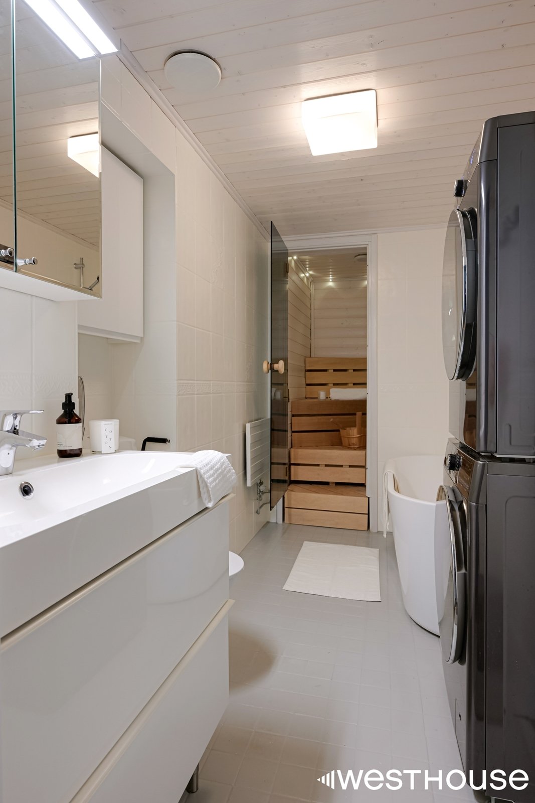 Kylpyhuonetta on remontoitu edellisen omistajan toimesta vuonna 2018. Kylpyhuoneen yhteydessä vaalea sauna.