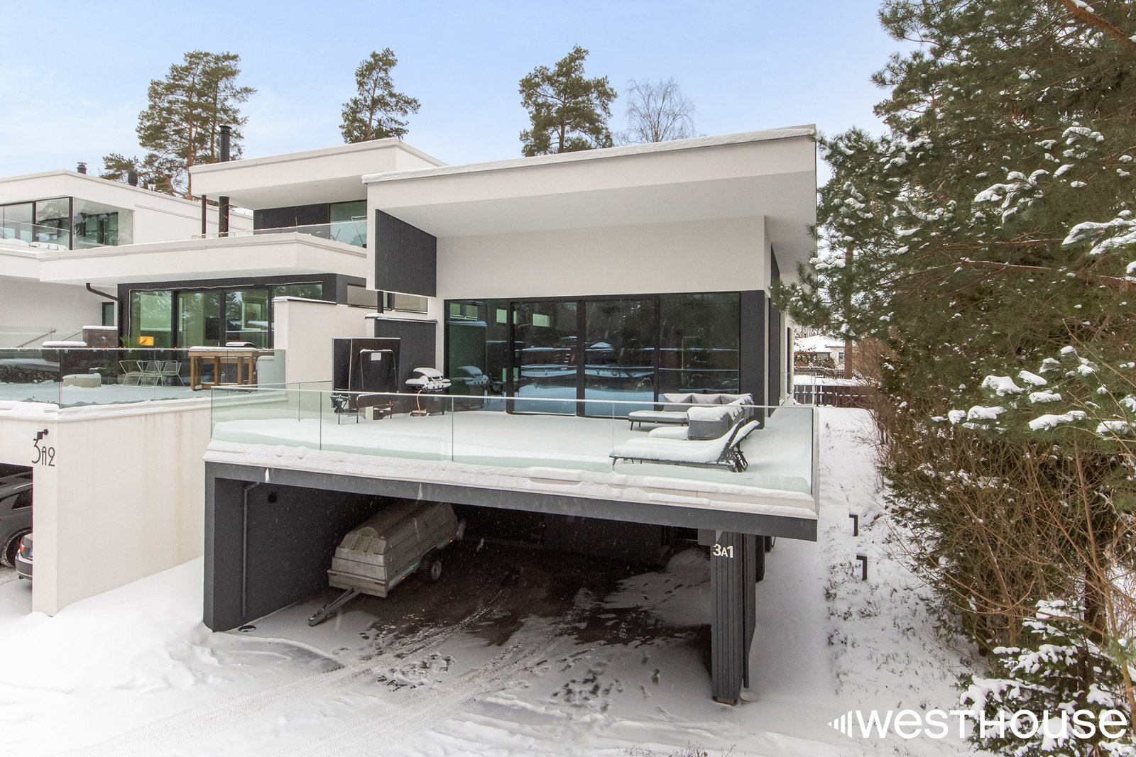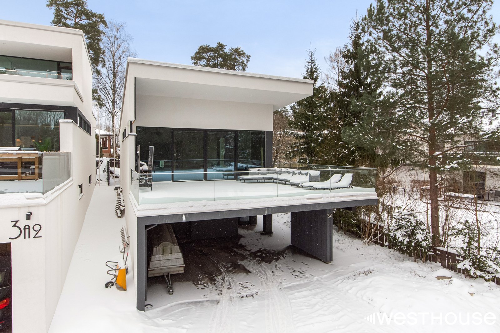 Autoja mahtuu pihalle useampi: kaksi katoksen alle ja yksi lämpimään talliin. Latausasema valmiina. Takapihalle mahdollista asentaa ulkoporeallas. Tällä hetkellä terassia ja puttigriini.