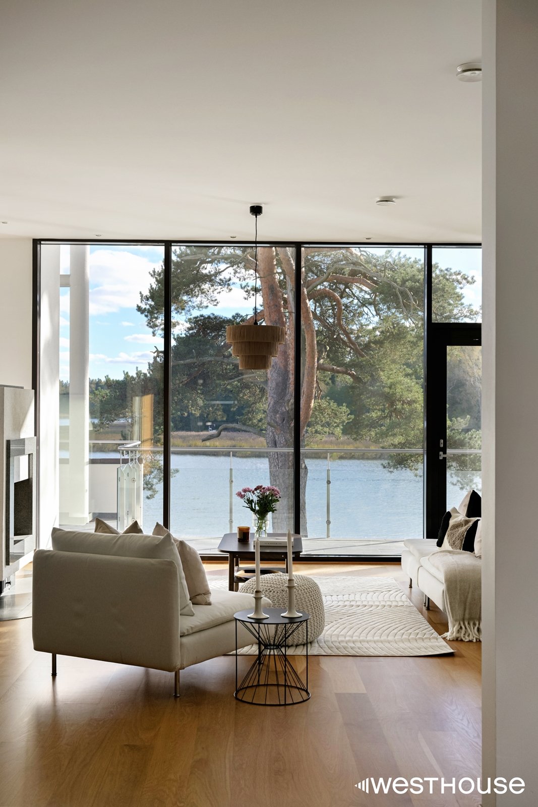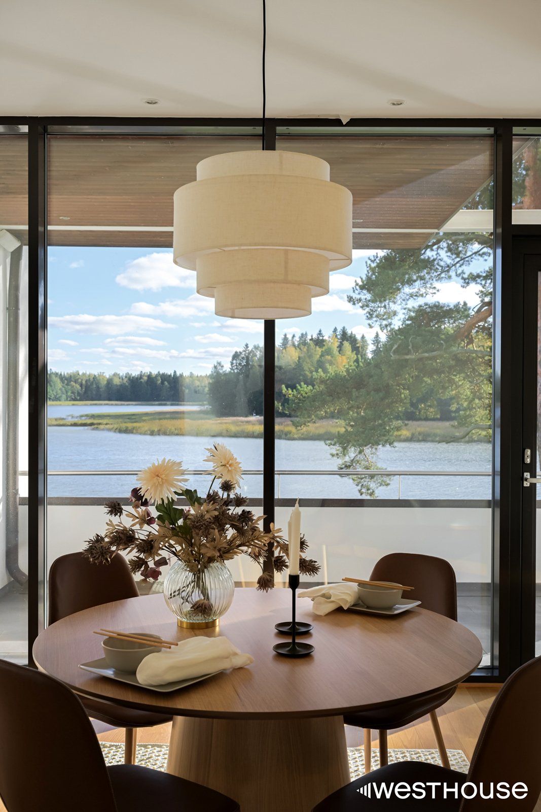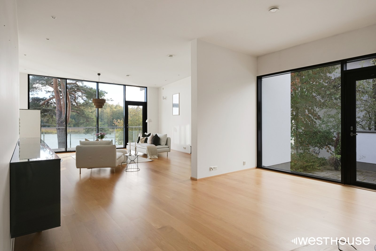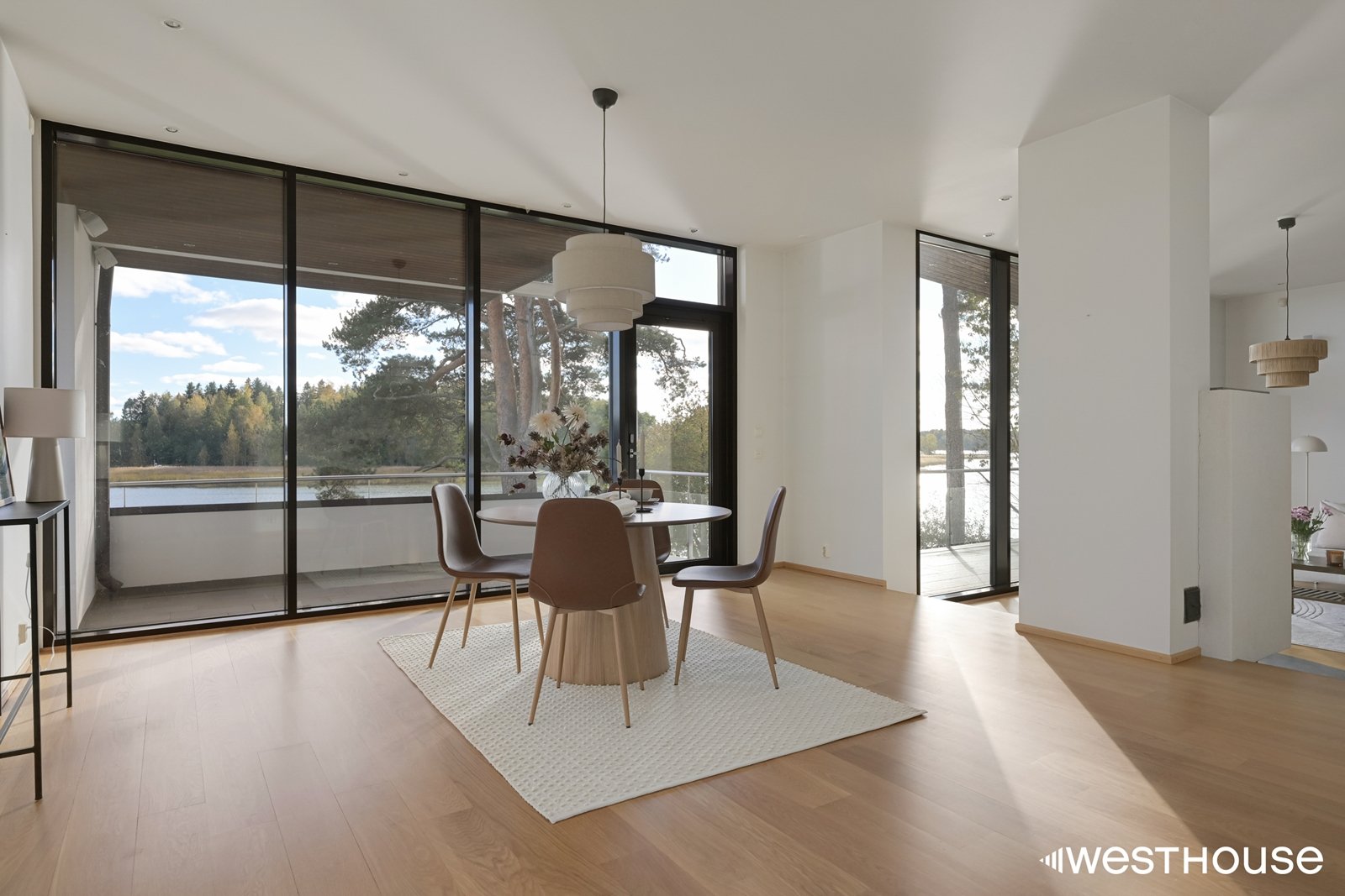 Pääsisäänkäynti on 1. kerroksessa. Astuessasi taloon, aukeaa avara merimaisema jo ovelta. Upean isoissa olohuoneen ja ruokailutilan ikkunoissa on lämmitys lisäämässä asumisviihtyvyyttä. Talon lämmitysjärjestelmänä toimii kaukolämpö. Ruokailutilasta on käynti koko talon levyiselle katetulle parvekkeelle, josta aukeaa hurmaava merimaisema. Moderni keittiö on sijoitettu sujuvasti erikseen ruokailutilan viereen. Olohuone on ylellisen avara. Merimaiseman lisäksi tunnelmanluojana toimii kaunis valkoinen takka isolla lasisella luukulla. Talon kaksi tilavaa makuuhuonetta sijaitsevat 1.kerroksessa. Molempien huoneiden yhteydessä on omat kylpyhuoneet ja vaatehuoneet – tämä kokonaisuus on suunniteltu täydellisesti. 1.kerroksen toisen sisäänkäynnin vierestä löytyy kodinhoitohuone, joka helpottaa arkea kurakeleillä.