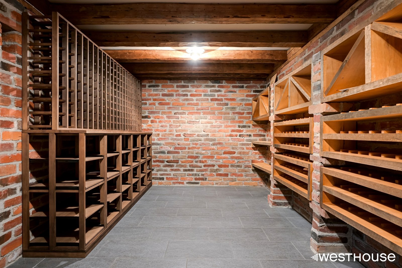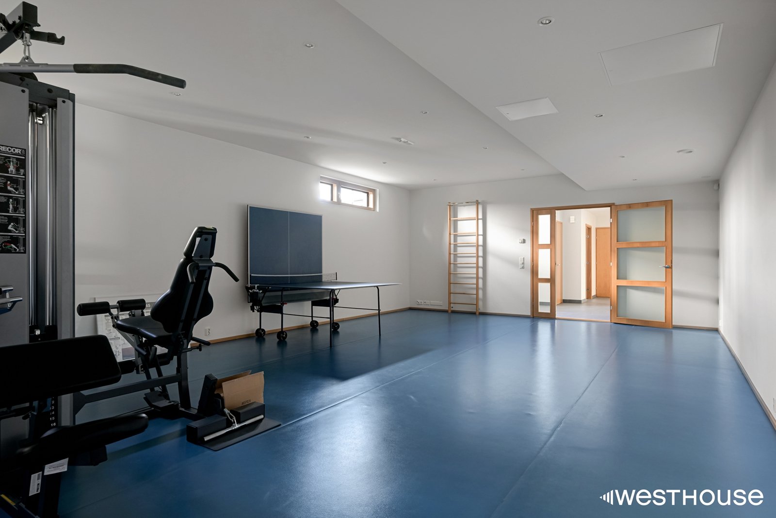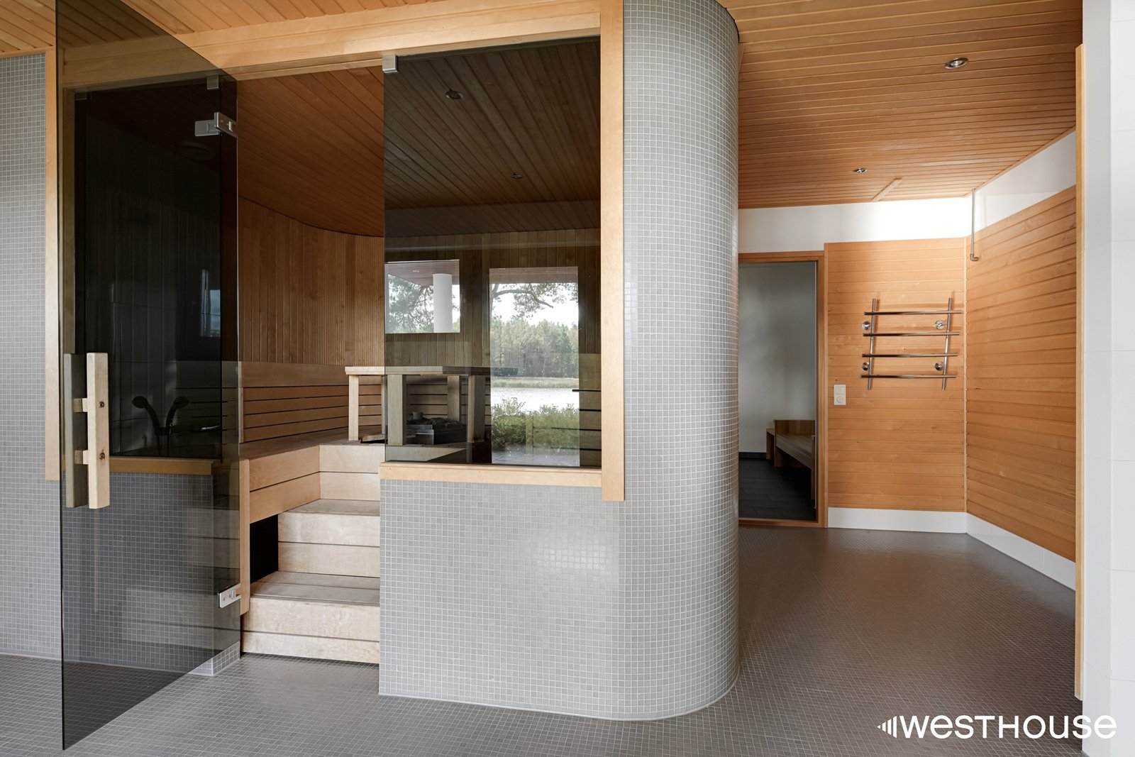 Merimaisemat jatkuvat myös alakerrassa. Saunaosasto pukutiloineen on tyylikäs. Alakerran takkahuoneesta löytyy perinteisen takan yhteydestä myös leivinuuni, joka on hurmaava yksityiskohta leipomiseen. Kuntosalin lisäksi on vaikka omalle joogastudiolle. Viinikellari viimeistelee upean kokonaisuuden.
