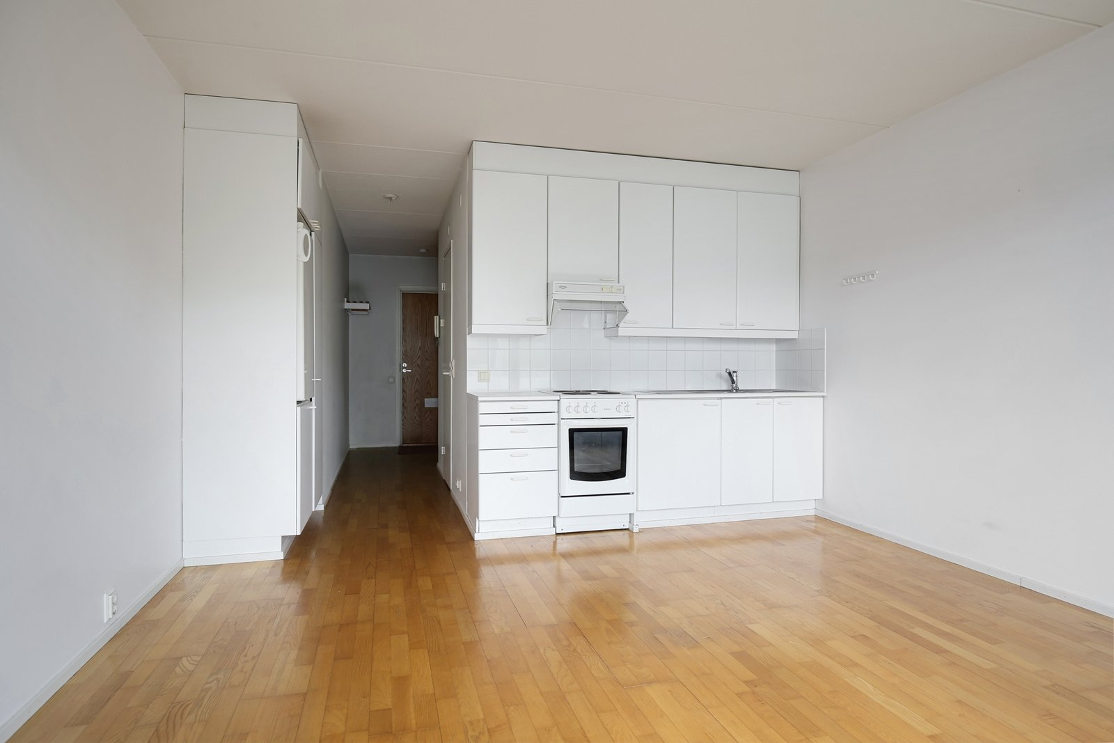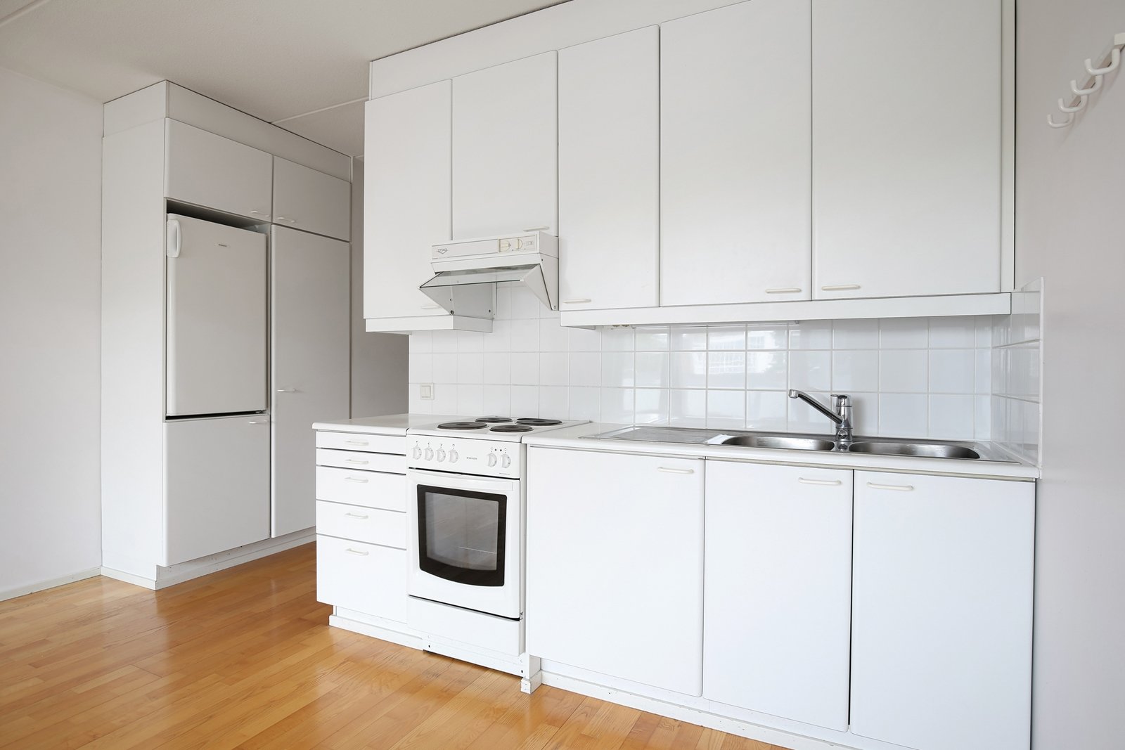 Avokeittiö olohuoneen yhteydessä, alkuperäinen valkoinen kaapisto. Liesi, aktiivihiilisuodatin, jääkaappi.
