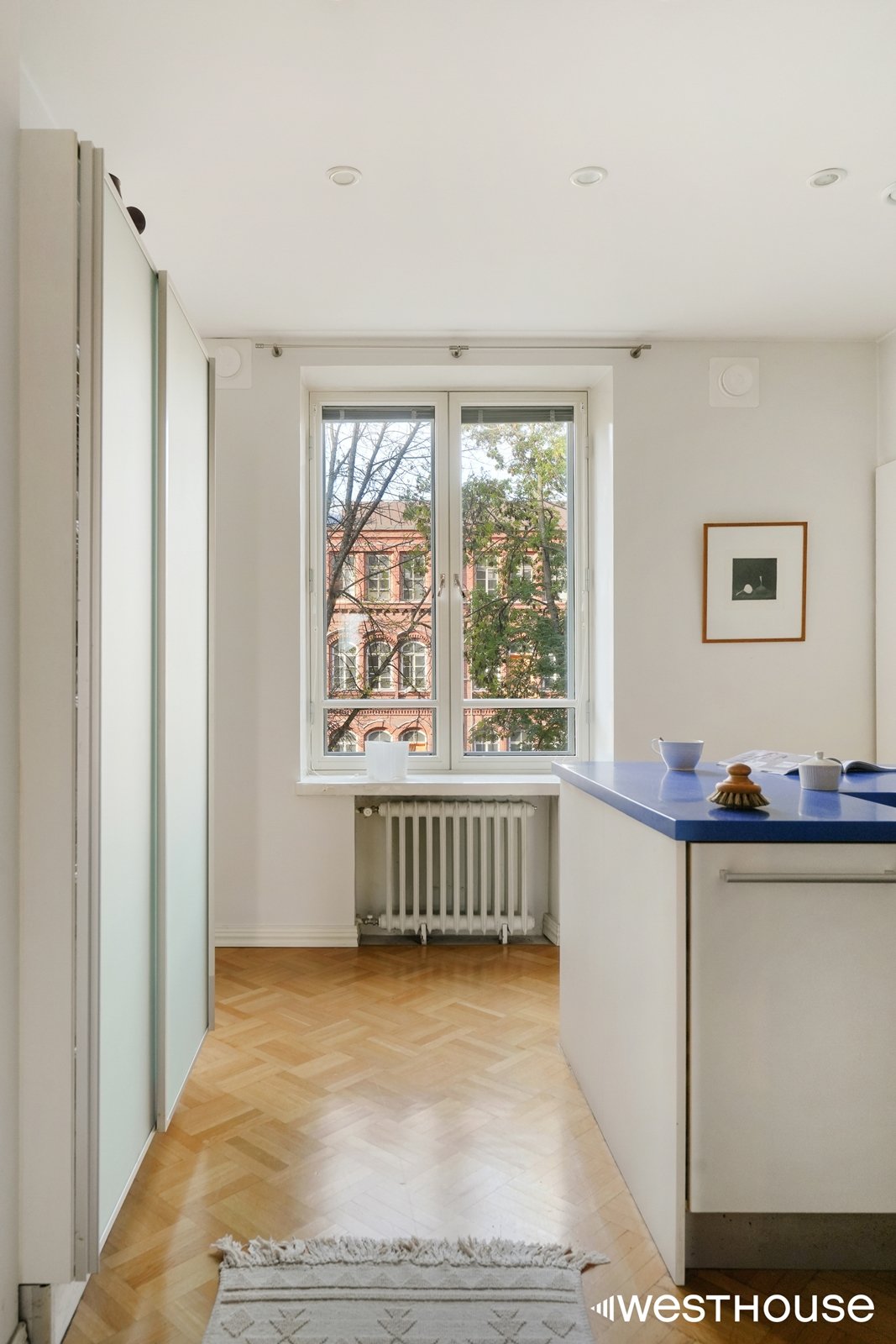 Keittiö liittyy pieneen viereiseen huoneeseen, mikä mahdollistaa tilan laajentamisen ja muokkaamisen omien tarpeiden mukaan. Huoneista avautuvat rauhalliset näkymät vehreälle sisäpihalle.
