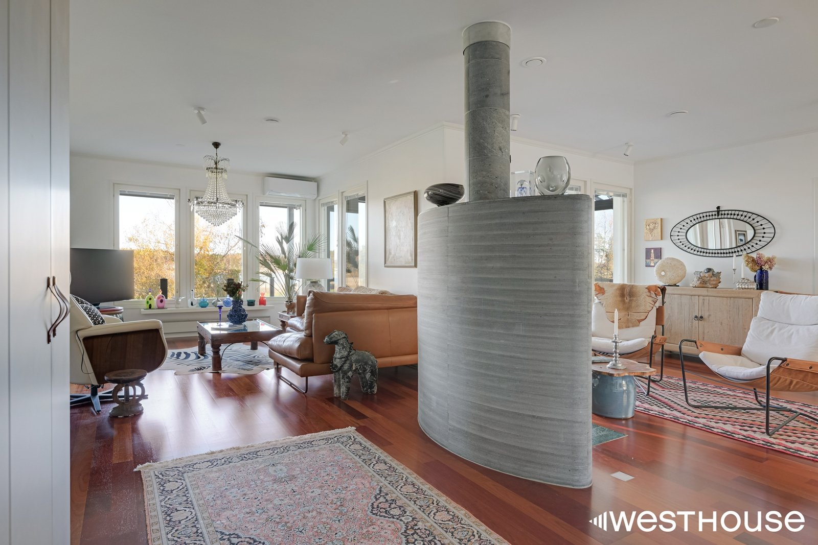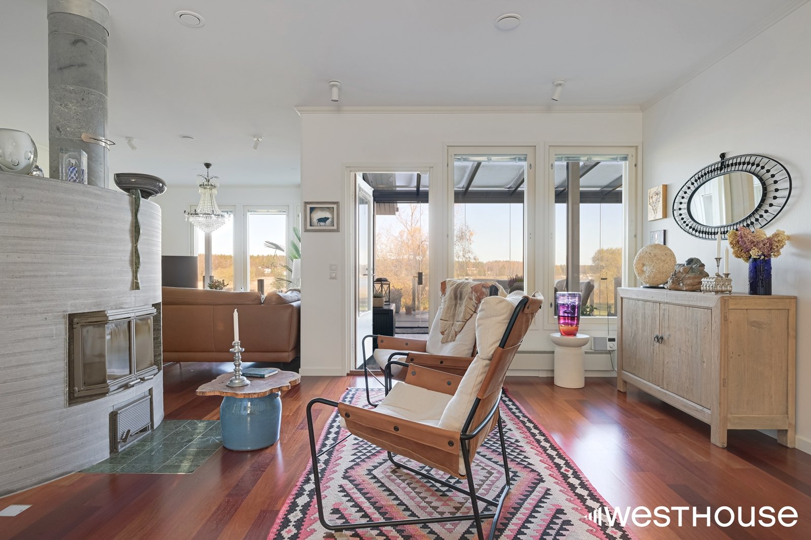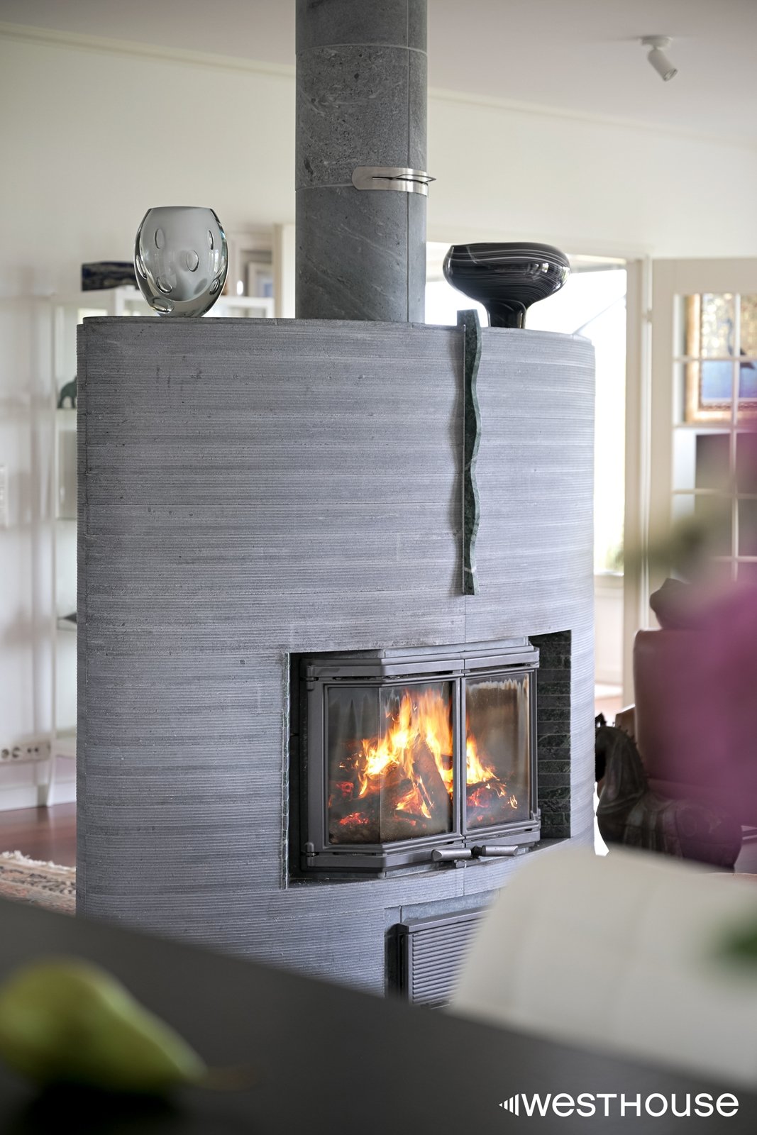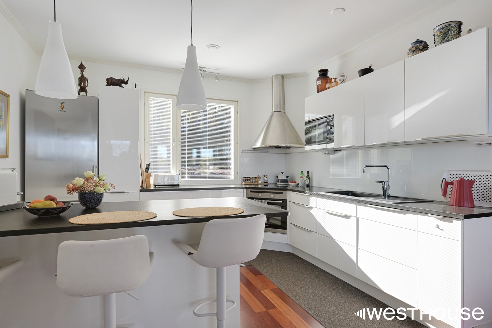 Talon sydämen luo olohuoneen kaunis takka, joka luo lämpöä ja tunnelmaa viileinä syys- ja talvi-iltoina sekä vaalea avokeittiö, josta avautuvat näkymät aina merelle saakka. Keittiön saareke ja laadukkaat kodinkoneet tekevät ruoanlaitosta nautinnon.