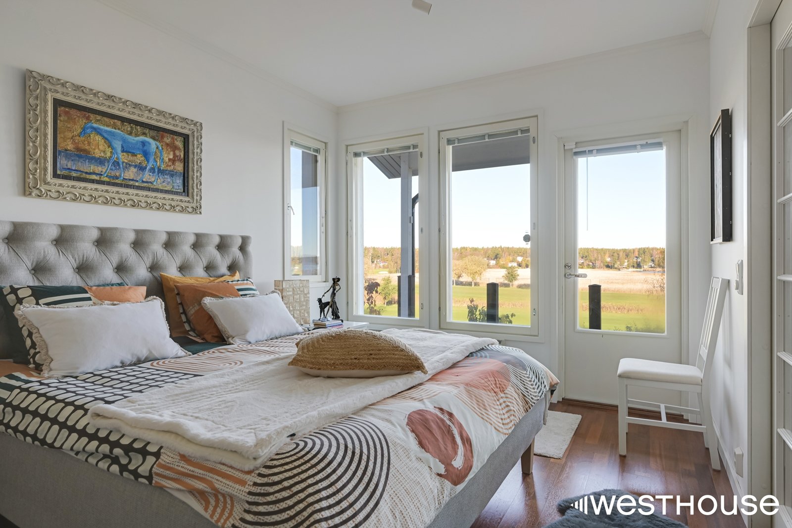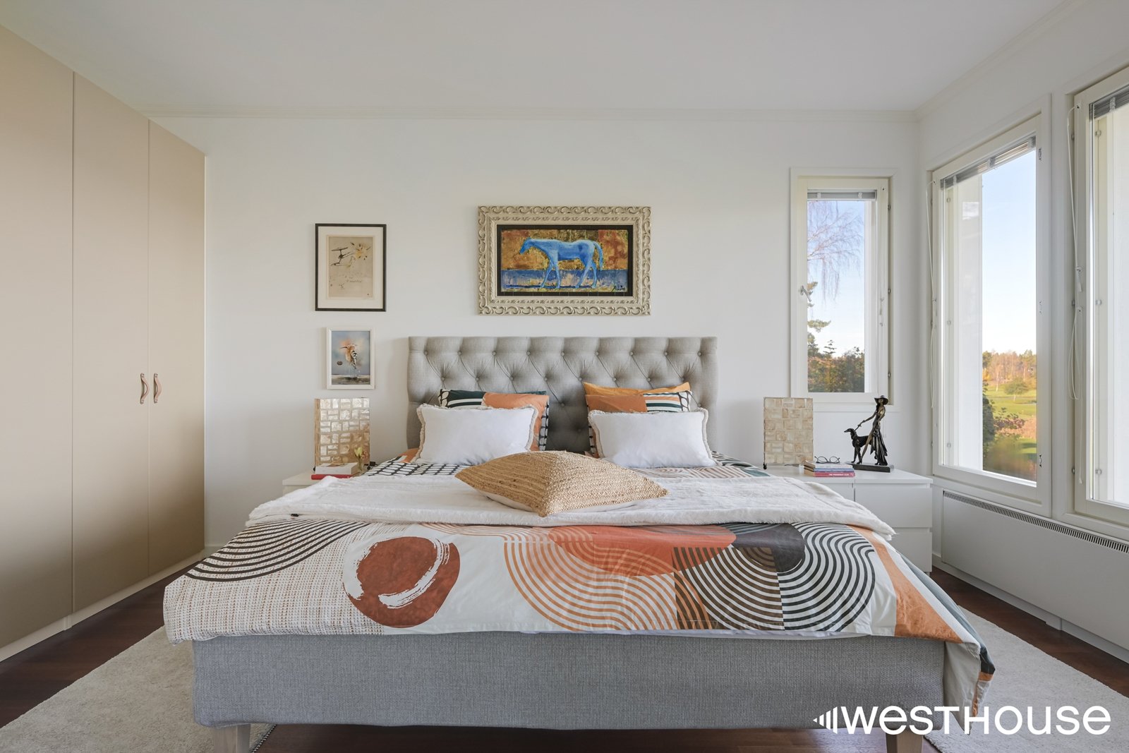 Kolme makuuhuonetta tarjoavat runsaasti tilaa perheelle tai vieraille. Päämakuuhuoneen lasiovet avautuvat olohuoneeseen ja makuuhuoneesta on myös käynti koko talon levyiselle terassille, mistä avautuvat upeat maisemat merelle yli vehreän golfkentän.