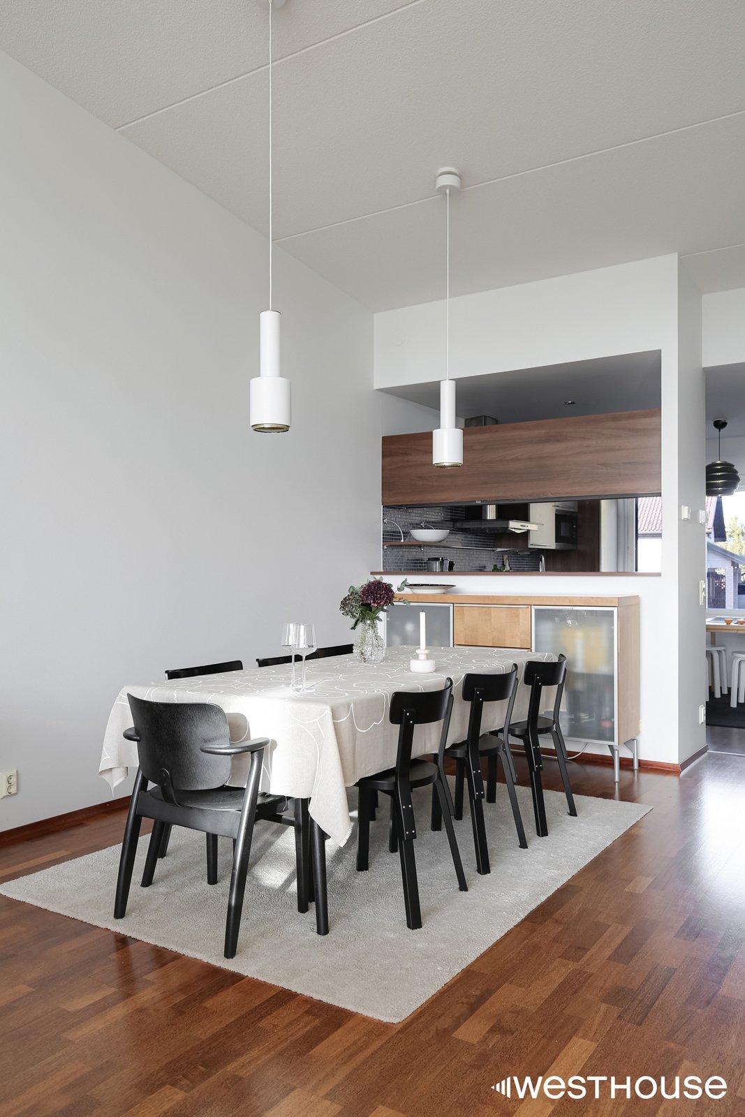 Keittiö on tilava ja hyvin varusteltu, ja sen yhteydessä on ruokailutila sekä ranskalainen parveke. Asunnon pohjaratkaisu mahdollistaa erilaiset käyttötarkoitukset; Makuuhuoneita voi olla tarpeesta riippuen jopa neljä. Yläkerran makuuhuoneen yhteydessä on vaatehuone ja kylpyhuone, mikä lisää asumismukavuutta. Kylpyhuone- ja wc -tiloja on runsaasti, joten arki on sujuvaa useammallekin henkilölle.