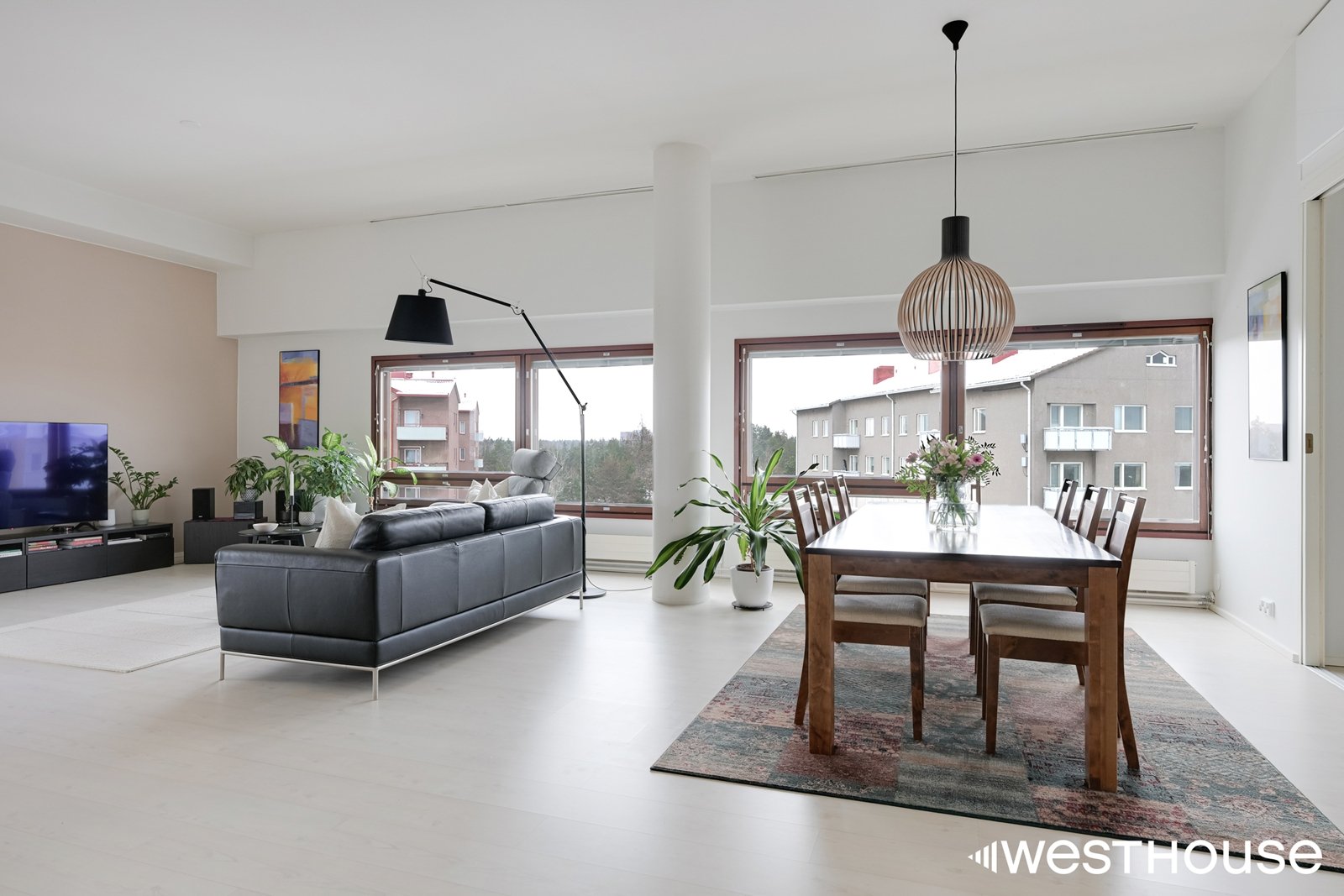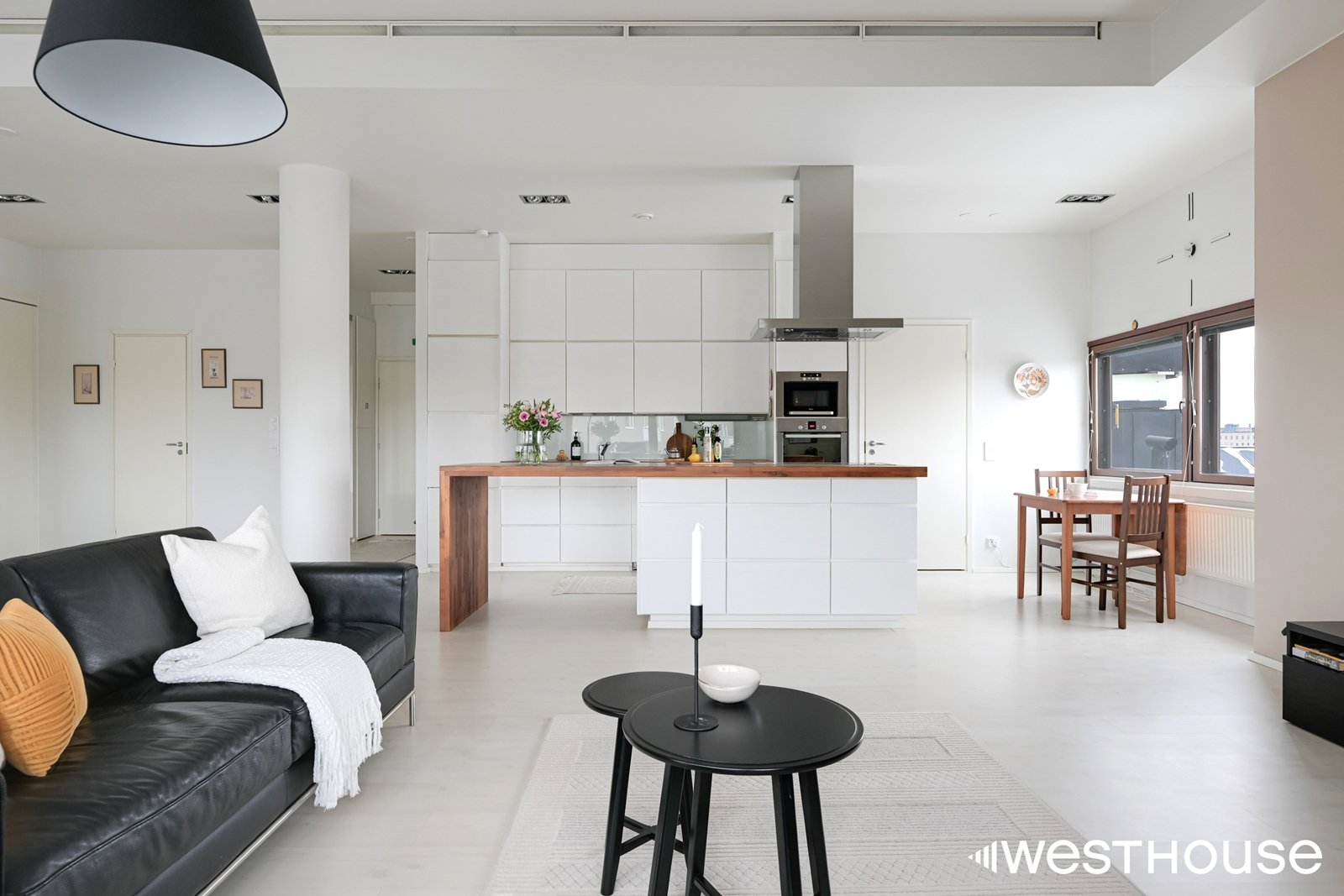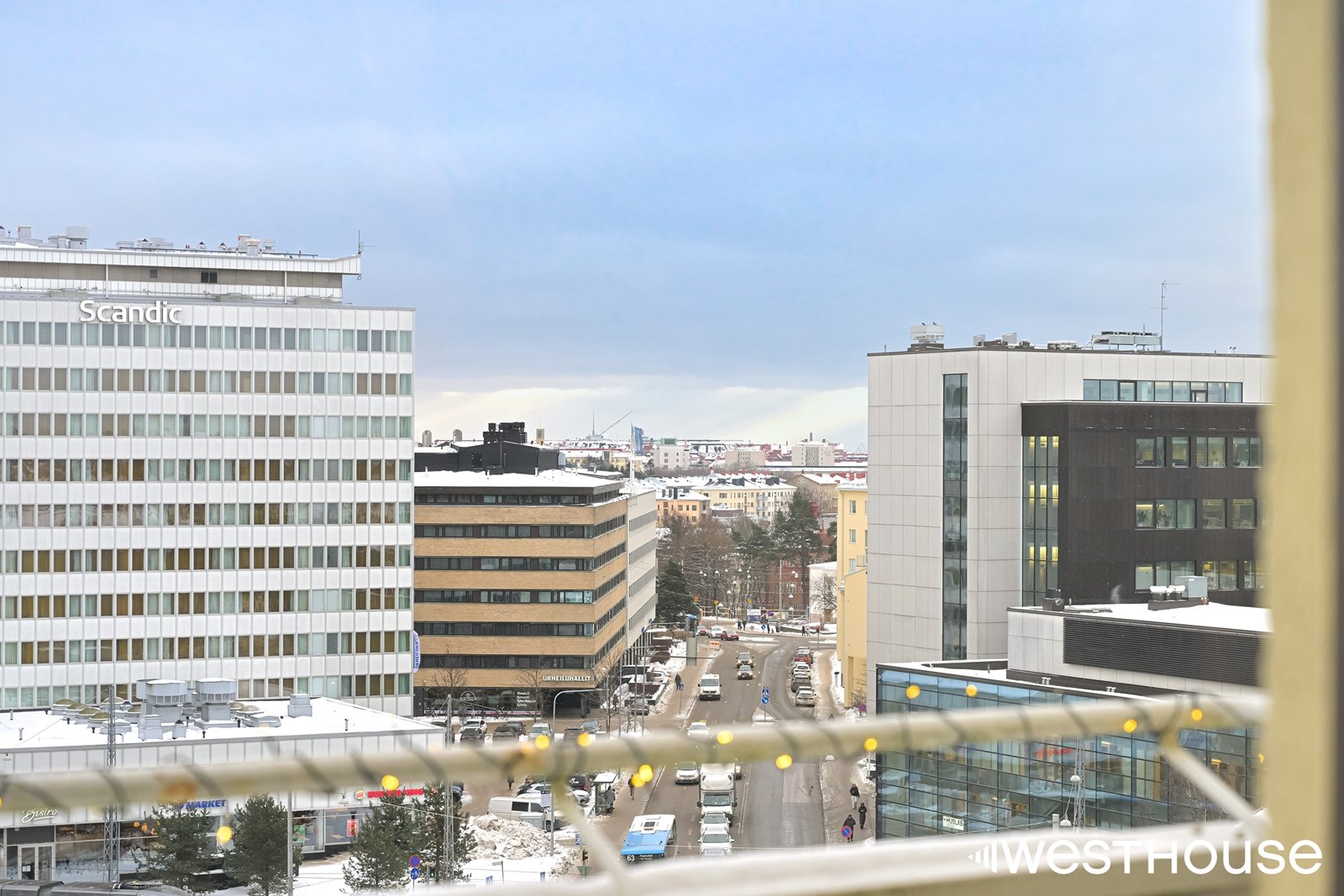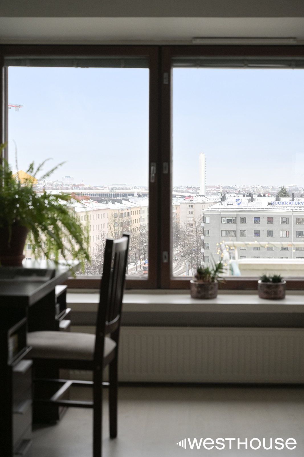 Avarat kaupunkinäkymät kattojen yli kolmeen eri ilmansuuntaan. Huoneiston valoisuus ja näkymät ovat poikkeukselliset.