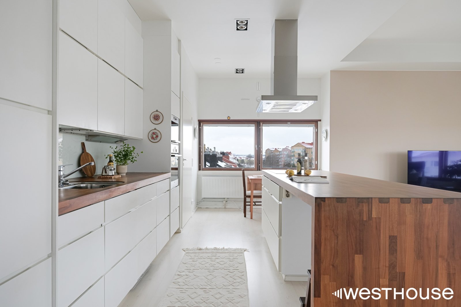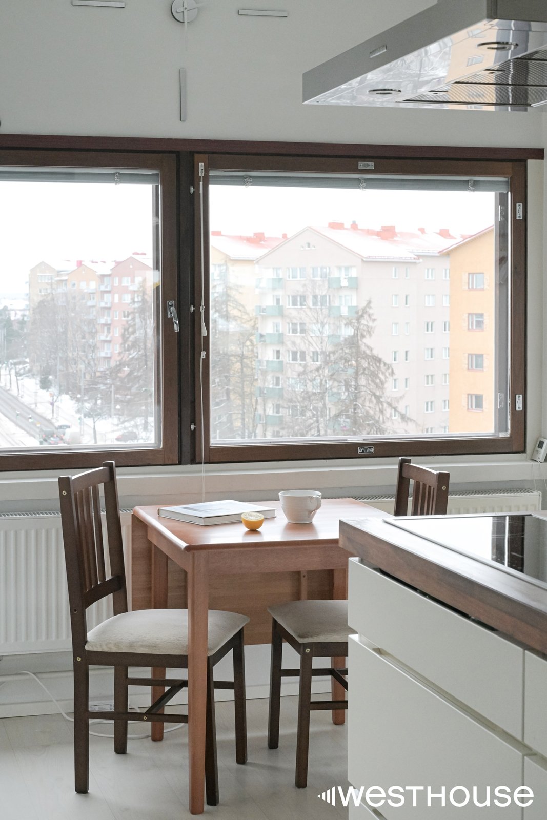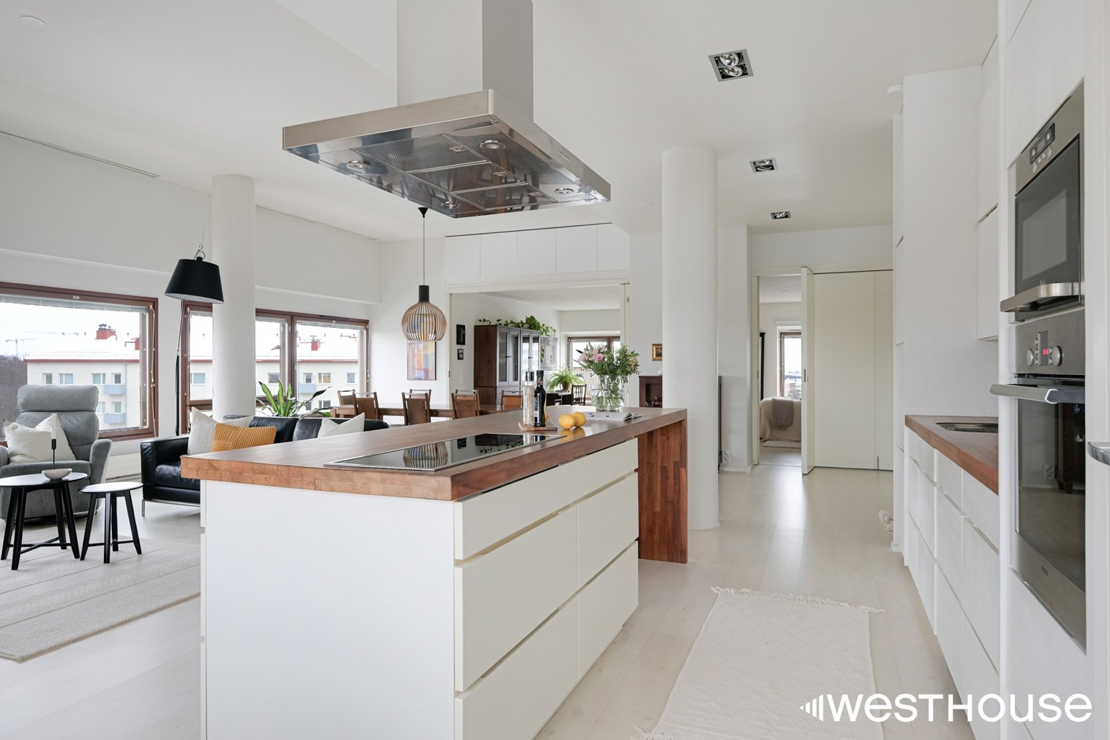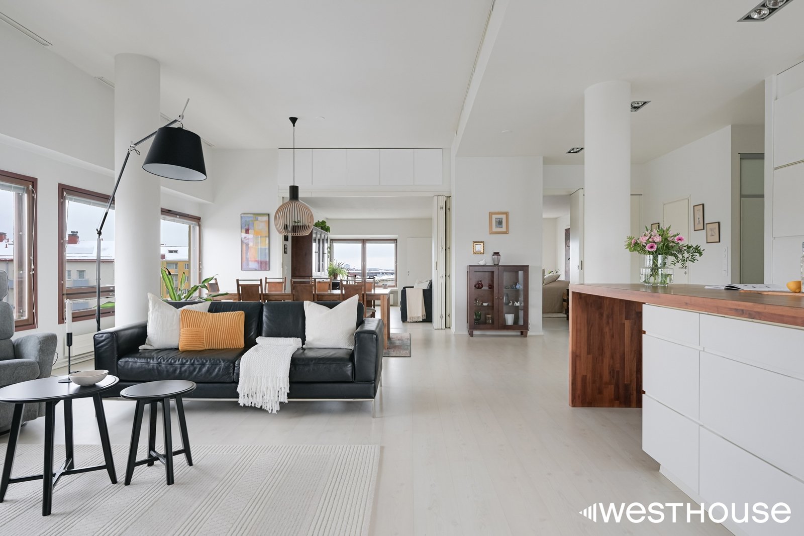 Avarat kaupunkinäkymät kattojen yli kolmeen eri ilmansuuntaan. Huoneiston valoisuus ja näkymät ovat poikkeukselliset.