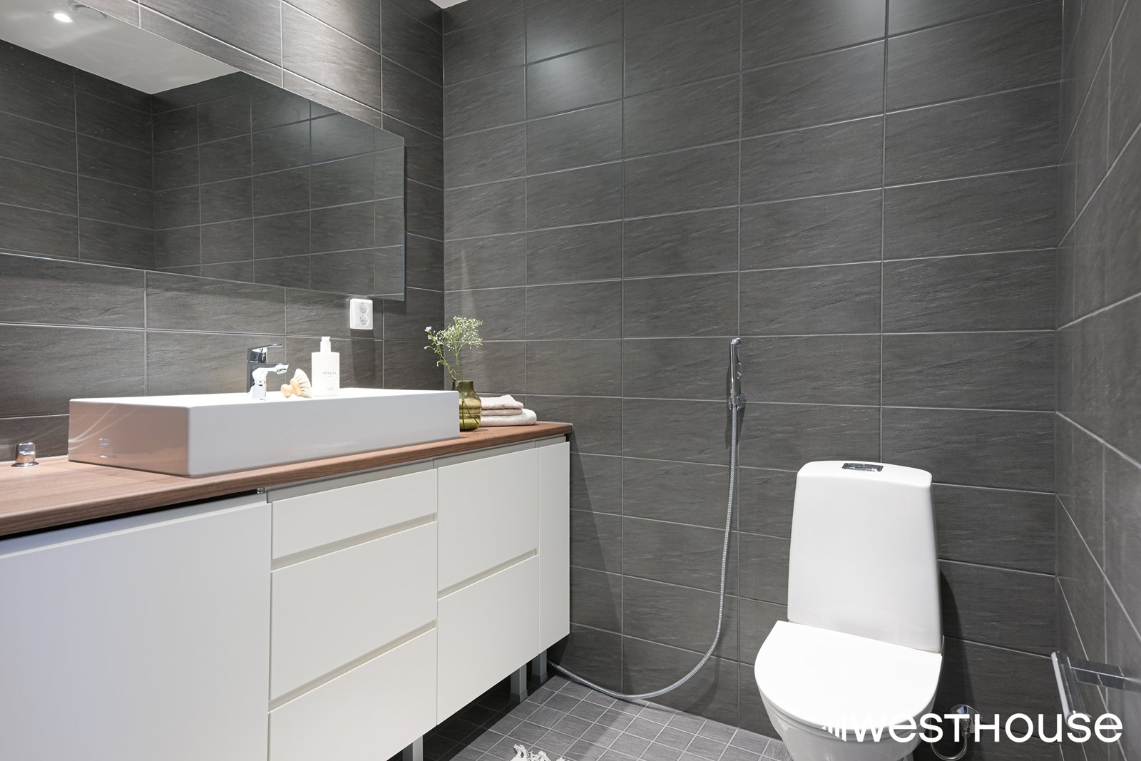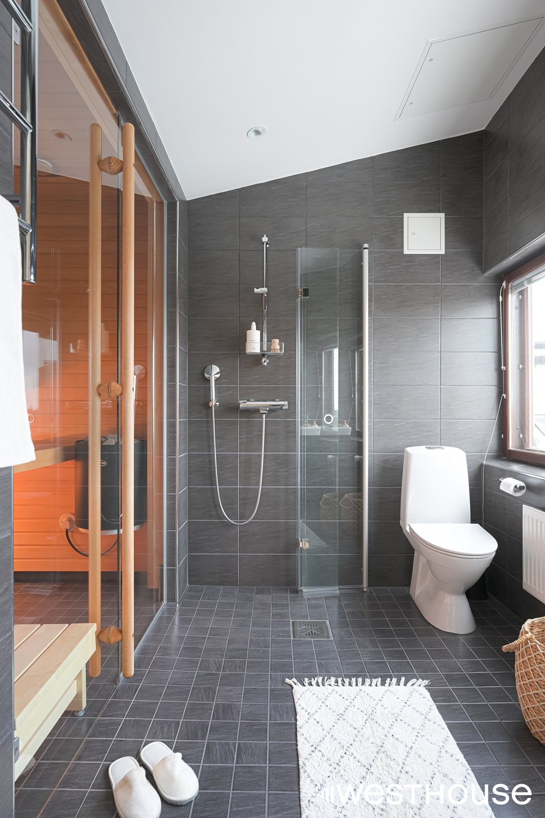 Asunnossa on LVIS -saneerauksen yhteydessä uusitut wc-/märkätilat. Kylpyhuoneessa wc -istuin, suihku, suihkuseinä, pyyhekuivain, käsienpesuallas, allaskaappi. Laattalattia, kaakeliseinät, lattialämmitys. Kylpyhuoneen yhteydessä sauna, josta näkymät kattojen yli Mannerheimintielle. Erillisessä suuressa wc -tilassa wc -istuin, bidee -suihku, käsienpesuallas, allaskaappi, peili, pyykinpesukone kuivaustoiminnolla. Laattalattia, kaakeliseinät, lattialämmitys.