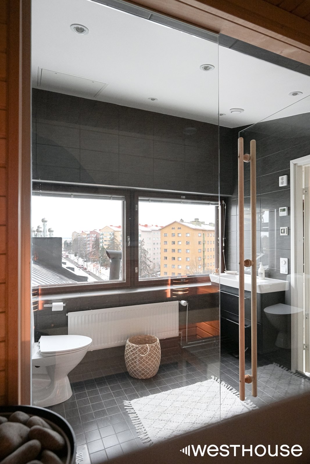 Iso linjasaneerauksen yhteydessä uusittu sauna, josta näkymät kattojen yli Mannerheimintielle. Kastor -sähkökiuas.
