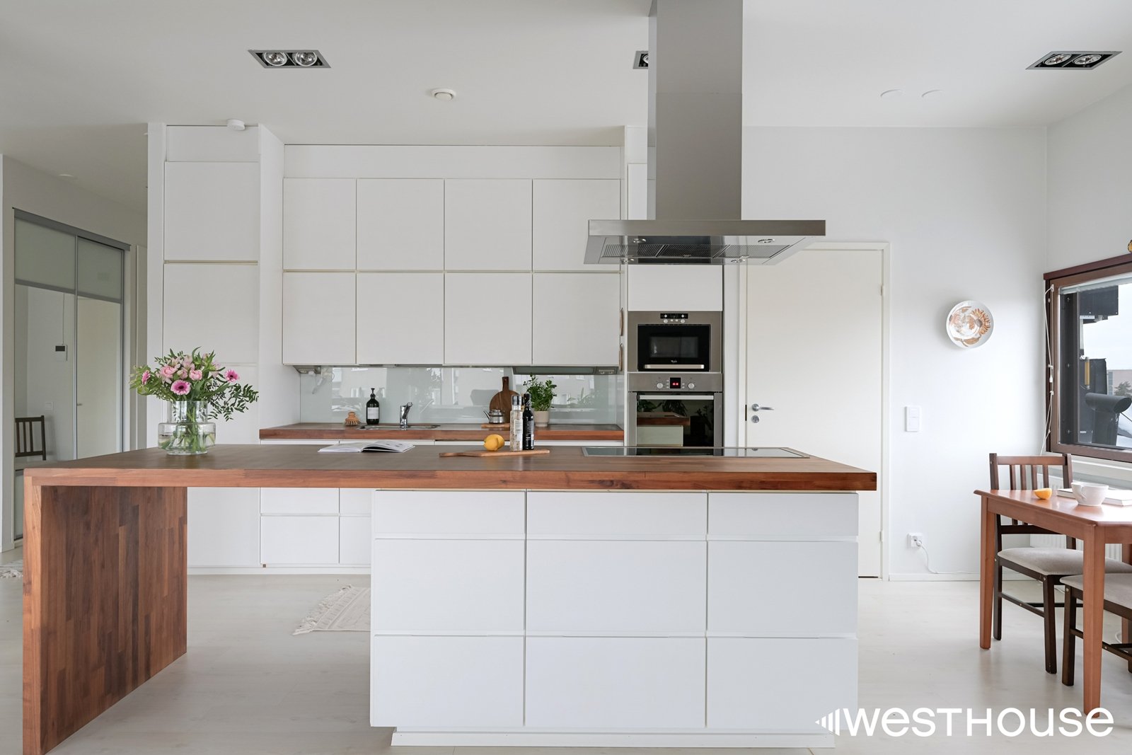 Moderni ja vaalea keittiö kaikilla varusteilla, korkeat pöytätasot, erillinen saareke